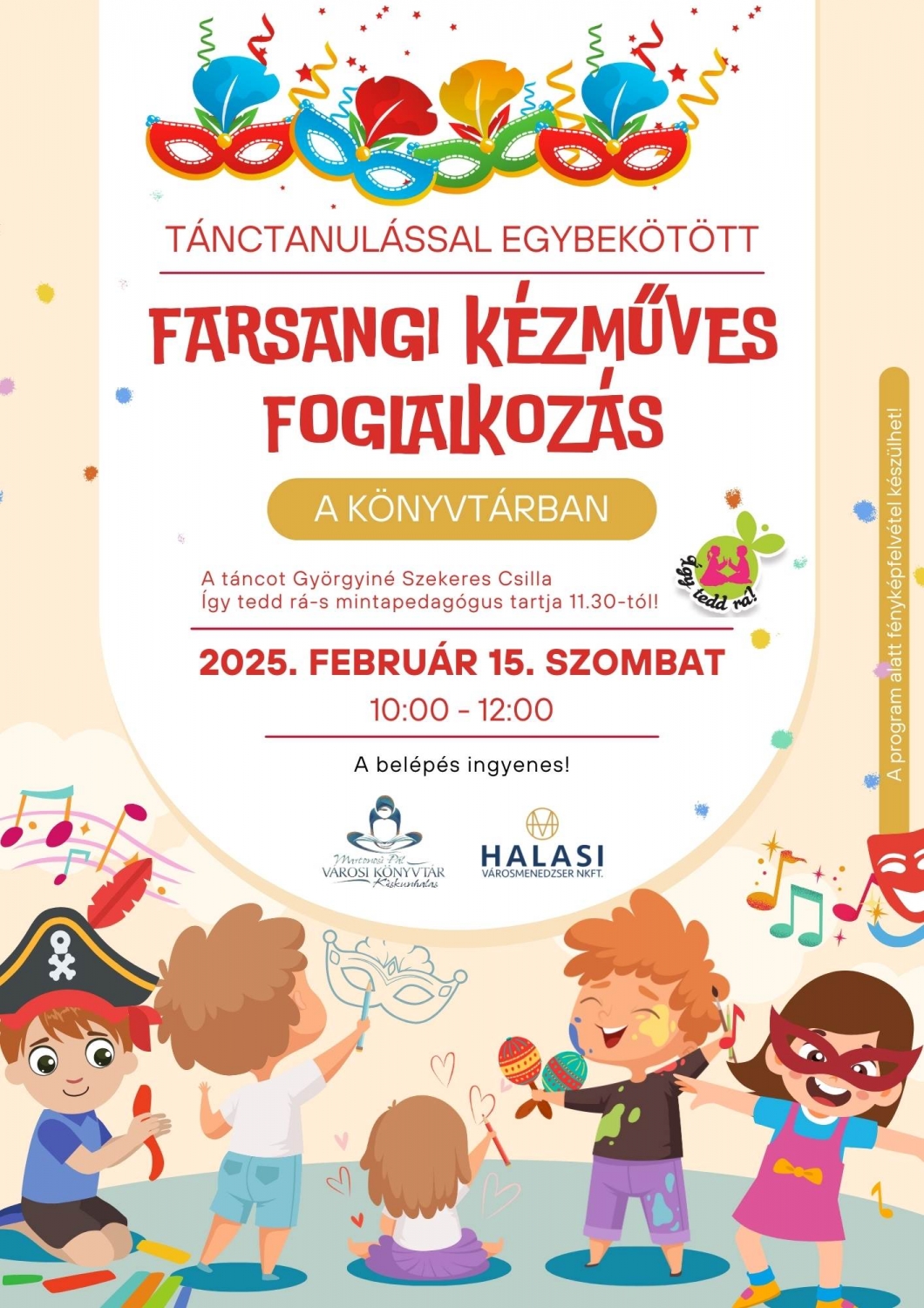 Tánctanulással egybekötött farsangi kézműves foglalkozás a könyvtárban