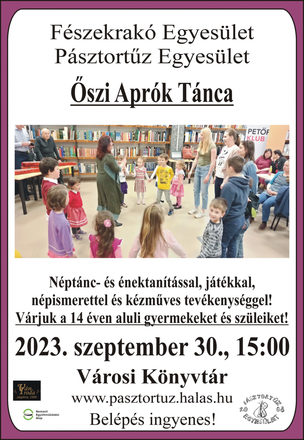 a Fészekrakó Egyesület és a Pásztortűz Egyesület szervezésében. Apróságoknak tánc- és énektanítással, kézműves tevékenységgel Várjuk a 14 éven aluli gyermekeket és szüleiket a Városi Könyvtárba (Kiskunhalas, Szövetség t. 11.)! Belépés díjtalan!