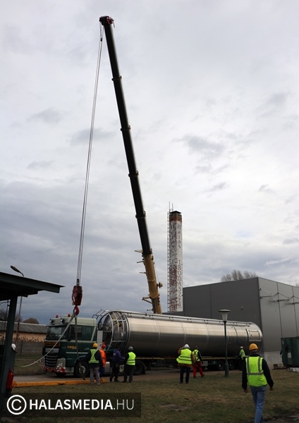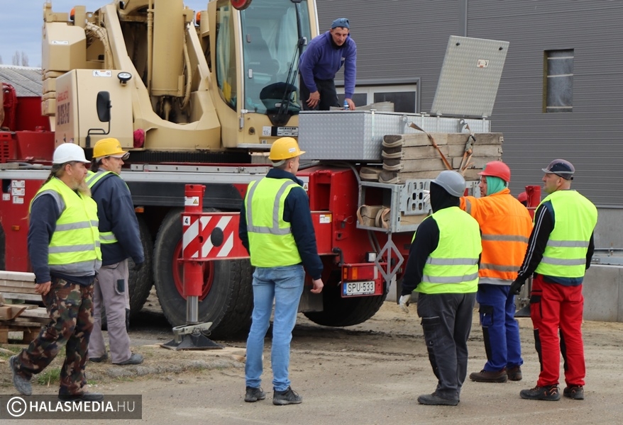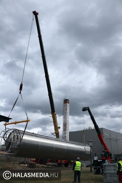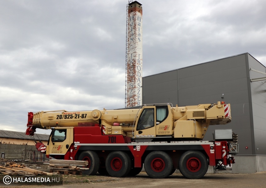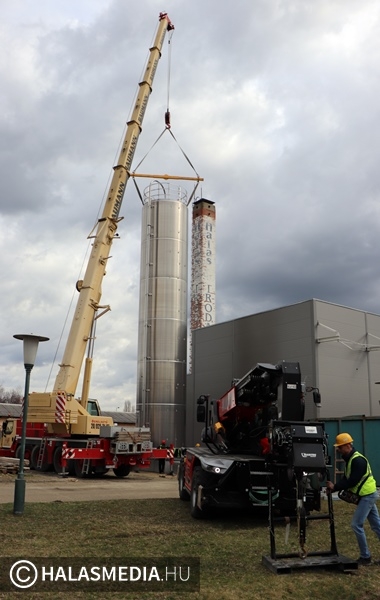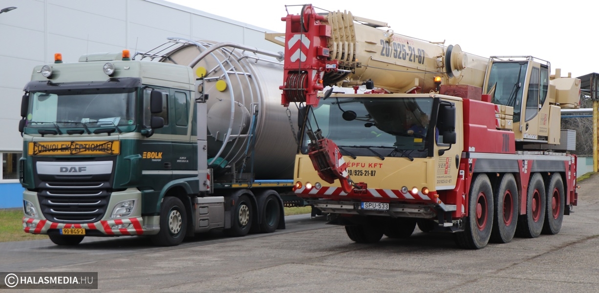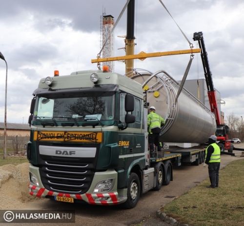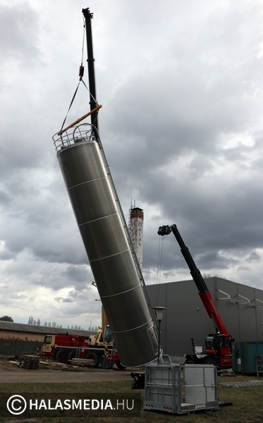 Speciális daru gurult be a napokban a Halaspack Bt. Majsai úti kapuján. A gép Kiskunfélegyházáról érkezett egy nem mindennapi munkafolyamat elvégzésére. Egy kiskunhalasi vállalkozás pedig a másik emelőszerkezetet biztosította. A gyár területén hónapok óta zajlik egy ragasztóanyag gyártására alkalmas üzemrész kialakítása, építése. Ennek fontos része egy 17 méter magas, 100 köbméteres siló helyére emelése. A jókora építmény egy kamion platóján érkezett Nyugat-Európából, a művelet pedig hosszas előkészítést egyeztetést igényelt a szakemberektől.