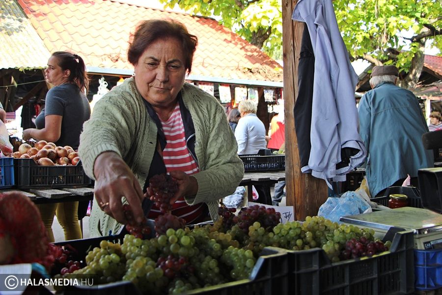 Fejes Antalné hosszú évek óta árul szőlőt a halasi piacon. Kecelről jár át szerdán és szombaton. Véleménye szerint egyre kevésbé éri meg mezőgazdasággal foglalkozni.