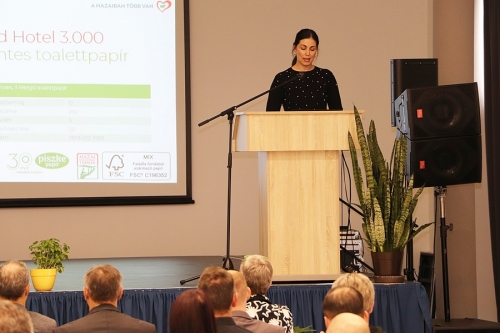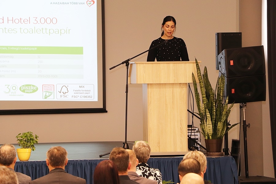 Bánkúti Fatime, a Magyar Piszke Papír Kft. marketing vezetője ismertette a 2024-es innovatív fejlesztést, a textilhatású szalvétát, melyet egy színben, nyomatlanul és ünnepi karácsonyi mintával is bevezettek a lakossági és közületi piacra. A szalvéták felelős erdőgazdálkodásból származó alappapírból vannak, közületi csomagolásuk fóliamentes.