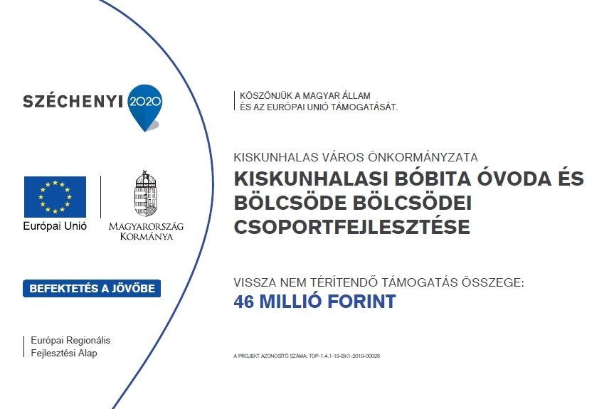Kiskunhalason egyre nagyobb az igény a bölcsődei férőhelyek iránt, így szükséges volt újra megnyitni a Bóbita óvoda épületkomplexumában a bölcsődei részt. Mostanra pedig sikerült kialakítani a kicsik igényeinek legmegfelelőbb körülményeket. A „Kiskunhalasi Bóbita Óvoda és Bölcsőde bölcsődei csoportfejlesztése” elnevezésű - TOP-1.4.1-19-BK1-2019-00025 - projekt 46 millió forintot biztosított a fejlesztésre. A beruházás Magyarország Kormánya és az Európai Unió támogatásával valósult meg.