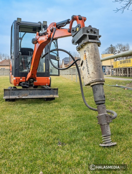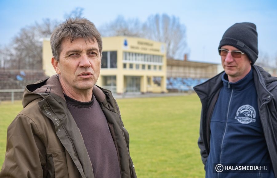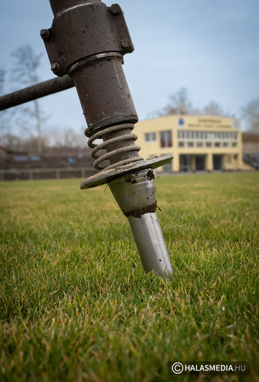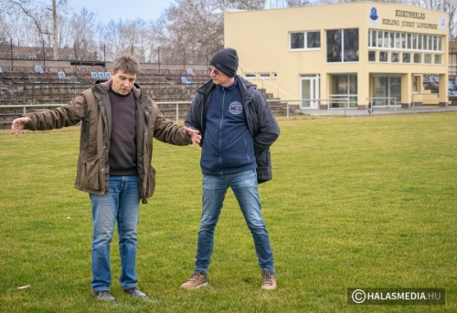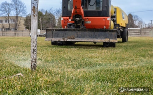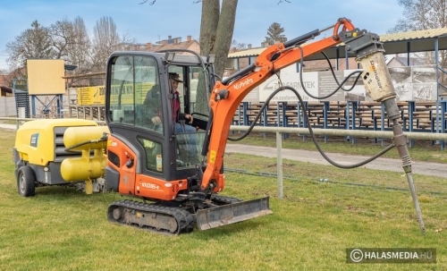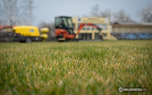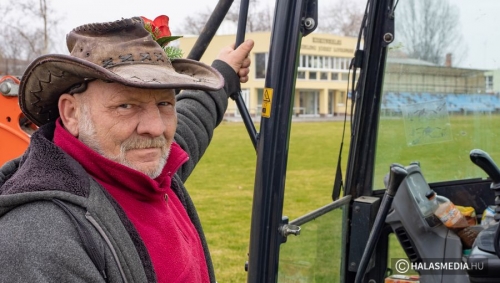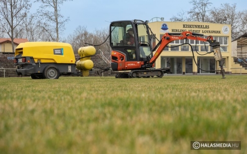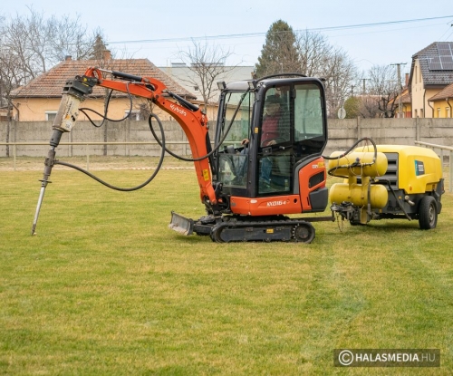 Faragó Endre (címképen), a Faragó Projekt BT. vezetője irányítja a füves pálya aktuális karbantartását. A szakember elmondta, hogy három különböző ipari gép egybeépítésével alkotott meg egy speciális talajregeneráló eszközt. Egy Kompresszor, egy hidraulikus mini kotró, tartályokkal lenyomócsővel és egy bontó kalapács végződés alkotja a rendszert. Tudósításunk készítésekor a berendezés működés közben, a levegő injekciókkal jól érezhetően megmozdított több köbméter talajt.