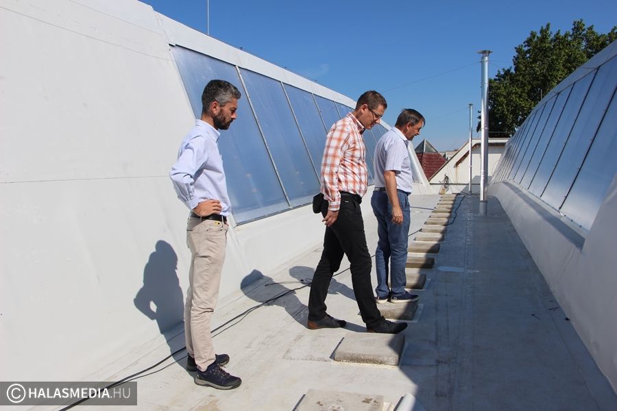 A korábbi nyílászárócsere és homlokzati falszigetelés után most újabb munkálatokkal folytatódik a Kossuth utcai Dékáni csarnok megújítása. - Fent a tető 20 centiméter vastag szigetelést kapott esővíz elleni réteggel. A felülvilágítókat pedig olyan fokozott szigeteléssel rendelkező rétegelt polikarbonát lapokkal cseréltük melyek felülete hővisszaverő. Itt lényegében már elkészültek a munkálatok – avat be a részletekbe Papp Gyula a Kiskunhalasi szakképzési Centrum főigazgatója. Bent a csarnokban viszont még javában dolgoznak. A régi padlót már felszedték, hiszen teljes csere történik, új sportparkettát raknak majd le.