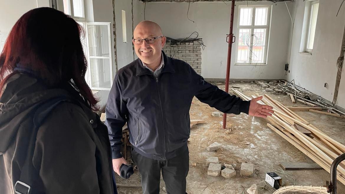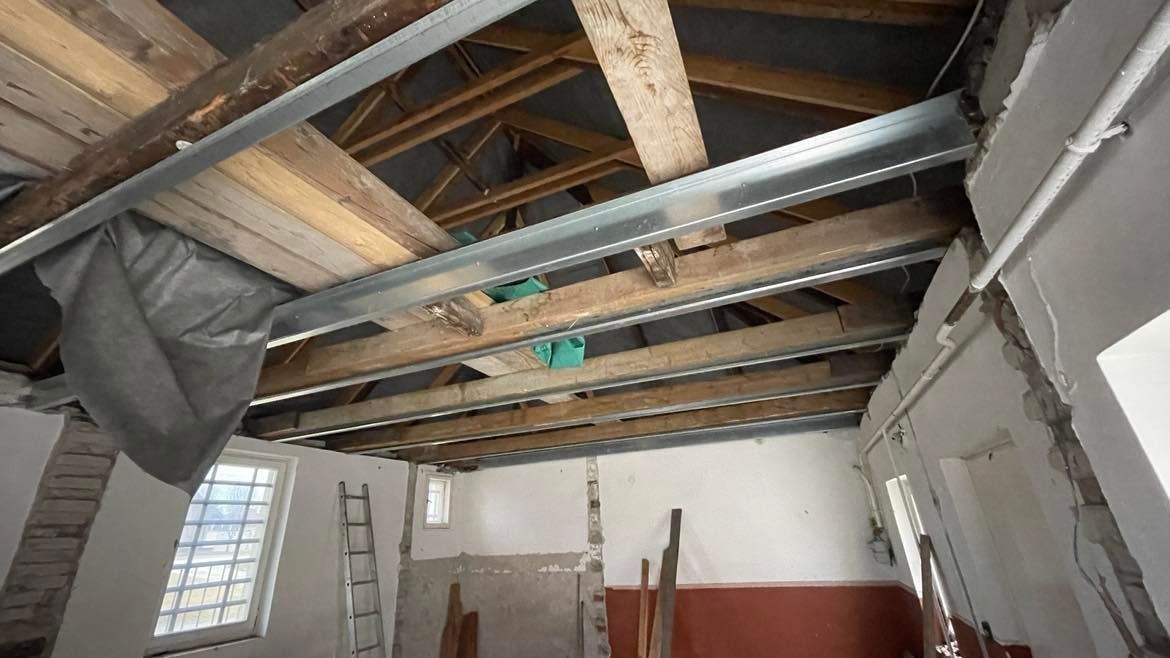 Az egykori kis irodákat összenyitották, így egy nagyobb teret tudtak kialakítani. Új nyílászárók, burkolatok lesznek, új lesz a fűtés és az elektromos hálózat, vagyis az épület kívül-belül megújul. A tetőcserét korábban saját erőből már megoldották.
