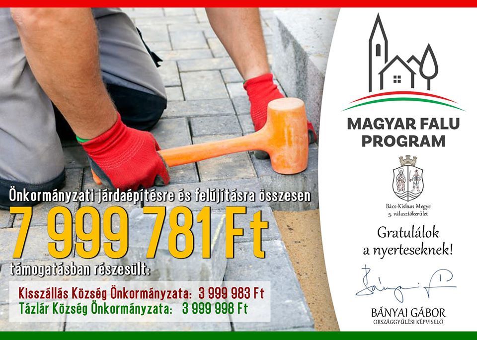 Útfelújításra többek között Kunfehértó, Tázlár és Zsana pályázott sikeresen. A járdaépítésre és felújításra kiírt pályázaton pedig Kisszállás Község Önkormányzata és Tázlár Község is nyert közel 4-4 millió forintot.