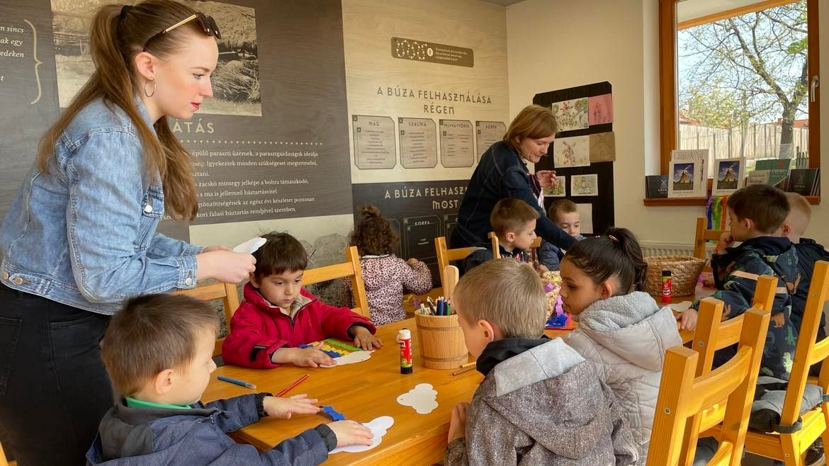A szélmalom udvarában ki lehetett próbálni a mezítlábas ösvényt, a homokozóban pedig szántottak a játék traktorokkal. A fogadóépületben is kreatív munka folyt, papírból, színes szalagokból felhőket készítettek az apróságok és közben énekeltek is.