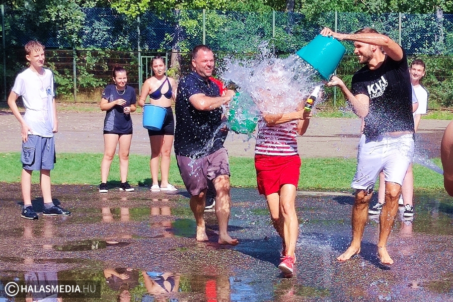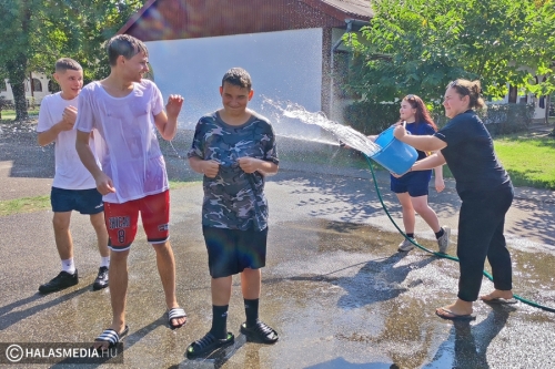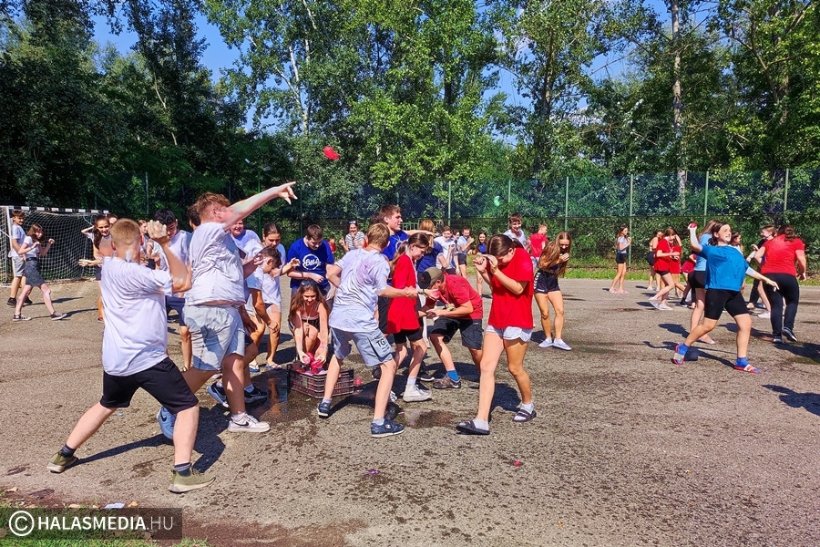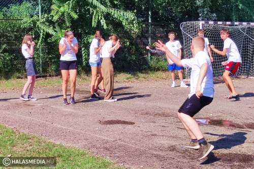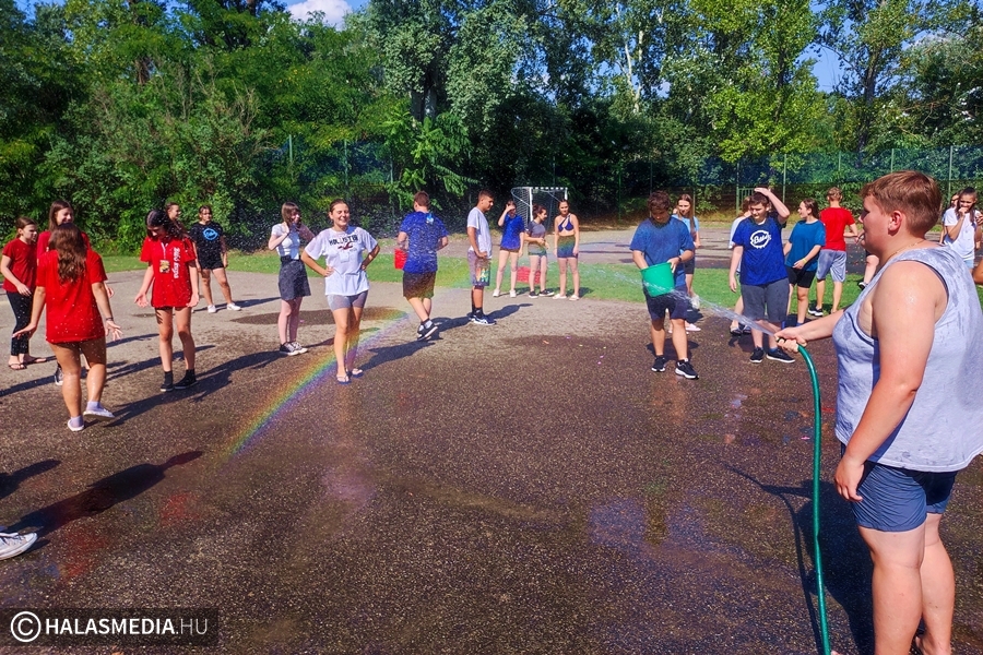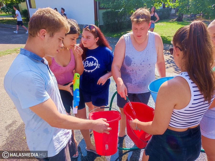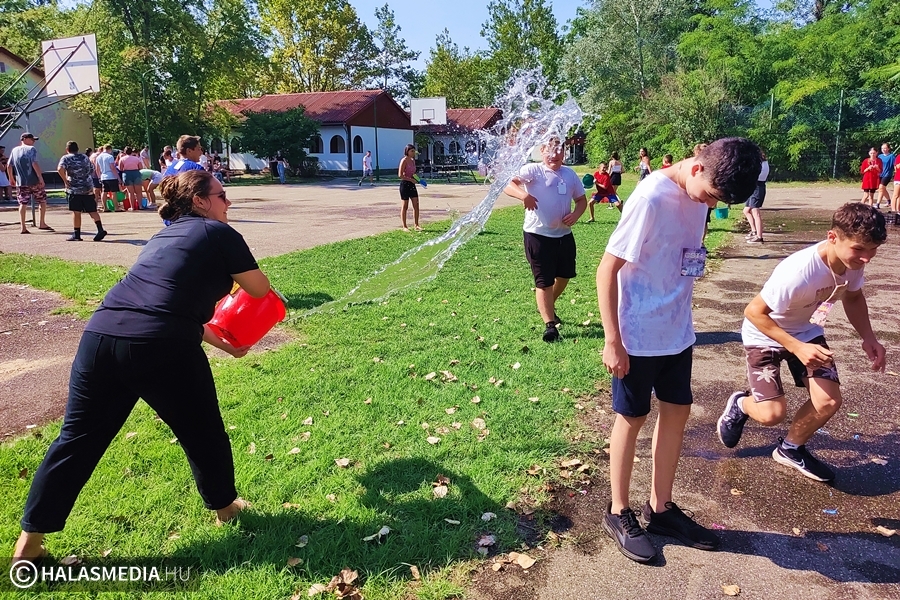 - Azért fontos a gólyatábor, mert így a diákok egymással, és velünk, pedagógusokkal is megismerkedhetnek. Nagy segítség nekünk is, hogy szeptember 1-én már a keresztnevükön tudjuk szólítani őket, s nem akkor kell bemutatkoznunk egymásnak – fejtette ki Juhász Ágnes osztályfőnök (akit fotónkon épp tanártársai öntöttek le vízzel).
