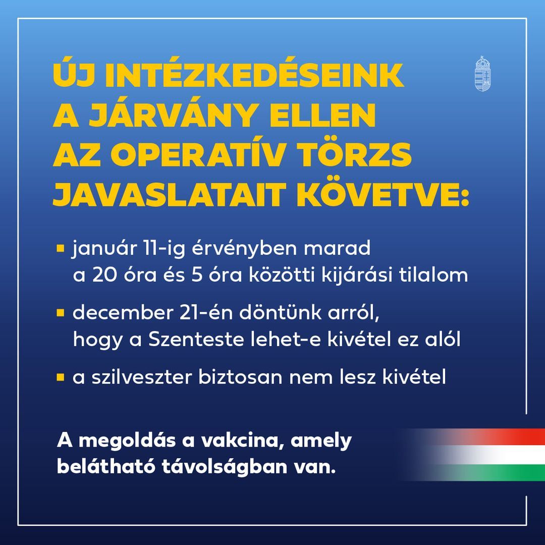 Meghosszabbították a védelmi intézkedéseket. Január 11-ig marad az éjszakai kijárási tilalom ugyanúgy, mint jelenleg, vagyis este 8 és reggel 5 óra között. „A szigorú intézkedéseket fenn kell tartani, mert karácsony jövőre is lesz, most az a fontos, mi is legyünk” Ennek megfelelően ma hajnalban az operatív törzs hozott néhány döntést. – jelentette be Orbán Viktor miniszterelnök.