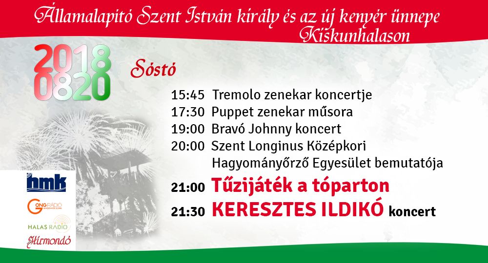 Közeledik augusztus huszadika, államalapításunk ünnepe. A Halasi Média és Kultúra Kft. két helyszínre várja az érdeklődőket, a Végh-kúria ad otthont az ünnepi műsornak és a kenyérszentelésnek, délután pedig a kikapcsolódáson lesz a fő hangsúly. A Sóstó partján könnyűzenei koncertek, látványos bemutatók lesznek, a tűzijátékot követően pedig Keresztes Ildikó koncertjét lehet megtekinteni.