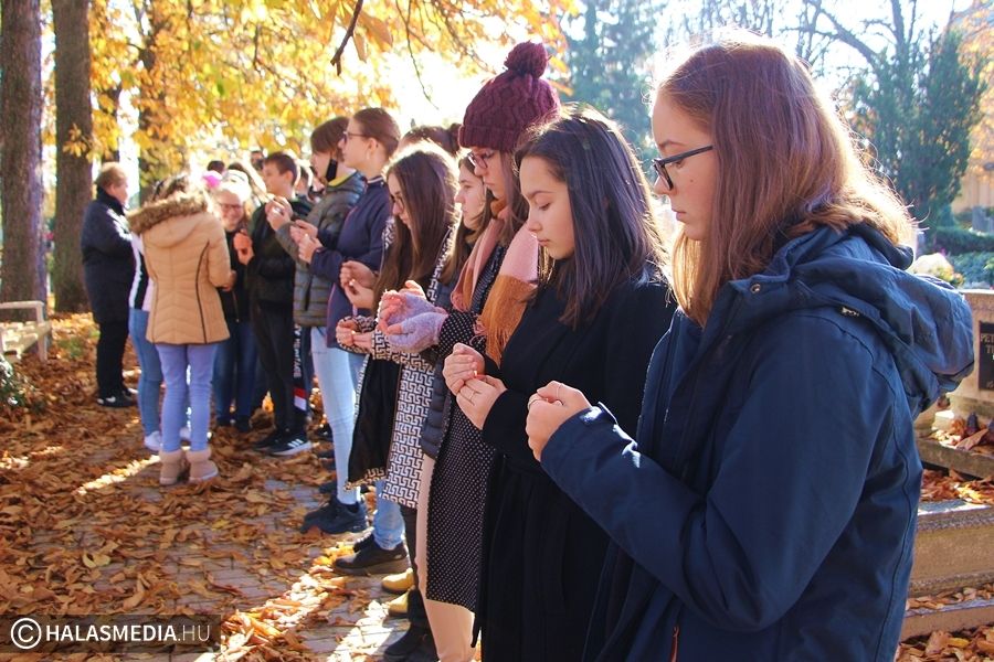 Virágokkal, mécsesekkel a kezükben érkeztek diákok és felnőttek ma délelőtt a kiskunhalasi katolikus temetőbe. A Pásztortűz Egyesület meghívására, egy közös megemlékezésre jöttek.