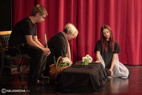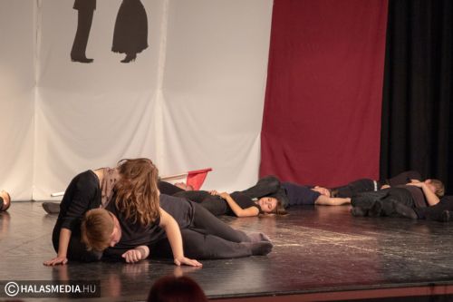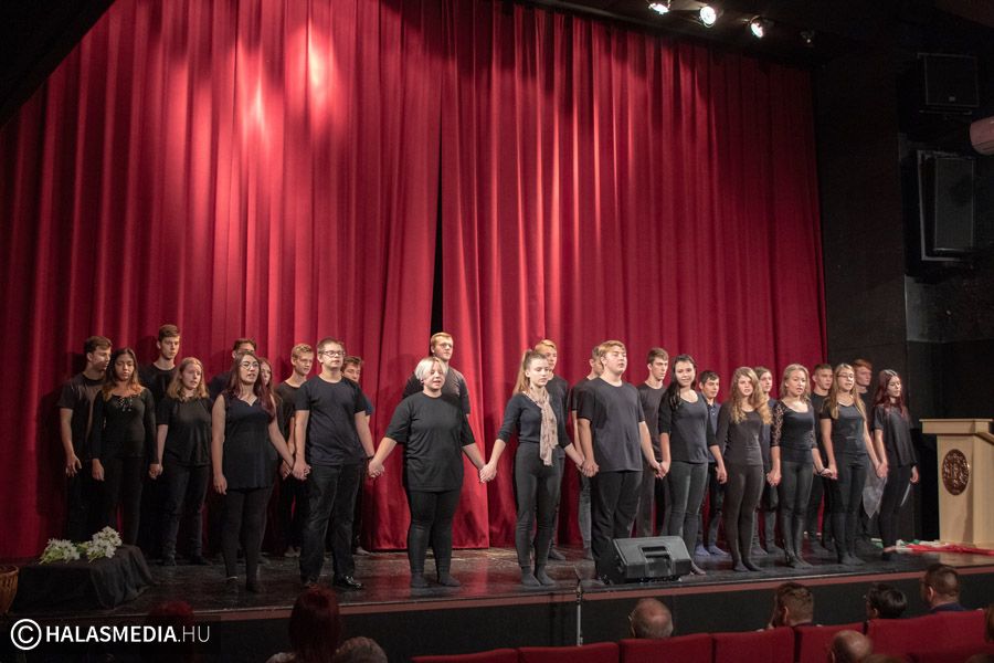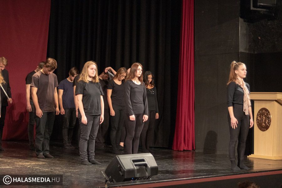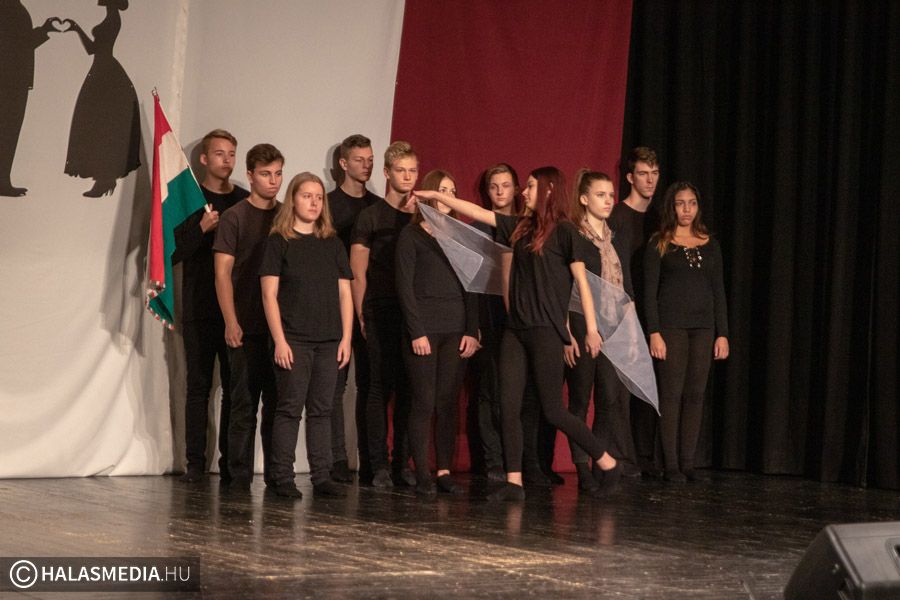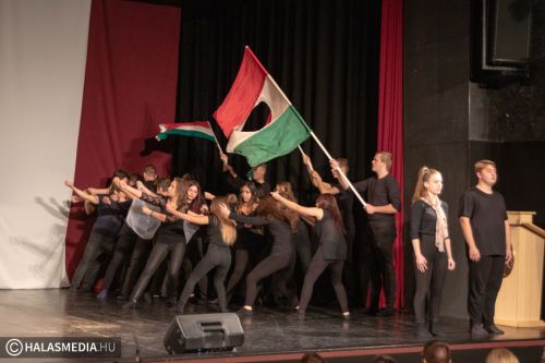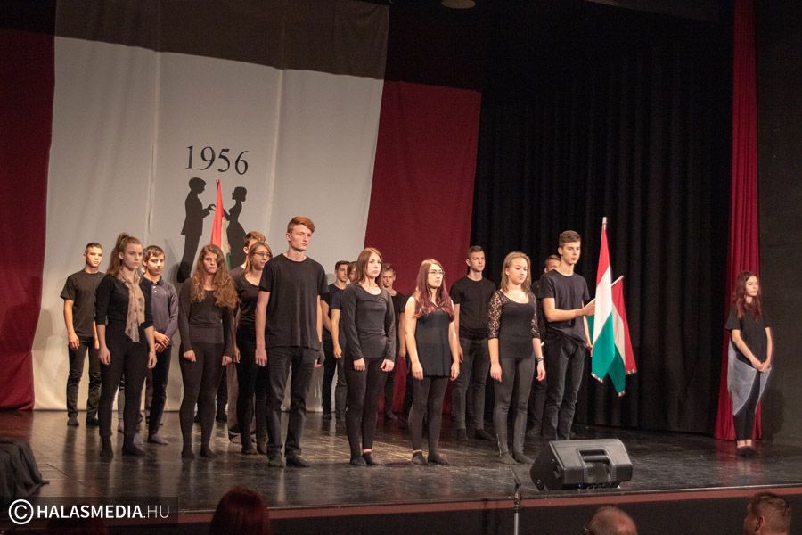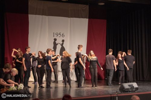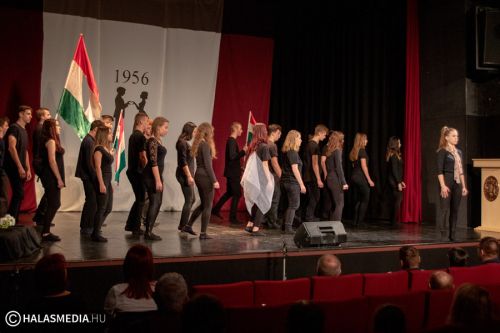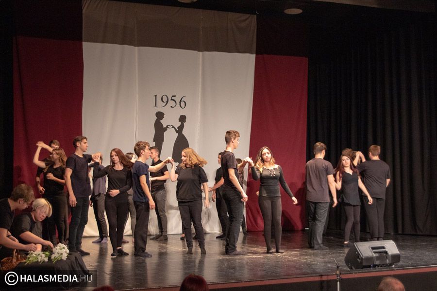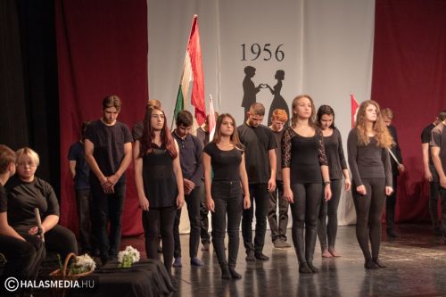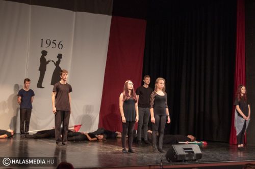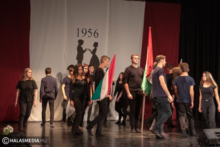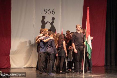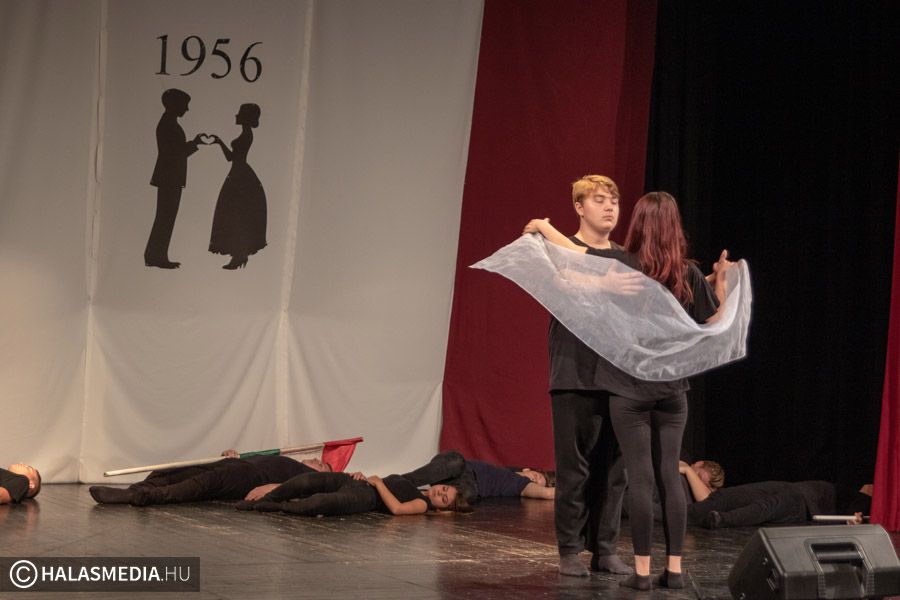 A Filmszínházban a Kiskunhalasi Szakképzési Centrum Dékáni Árpád Szakgimnáziumának rendészet és drámatagozatos diákjai elevenítették fel műsoruk során az 56-os történéseket.