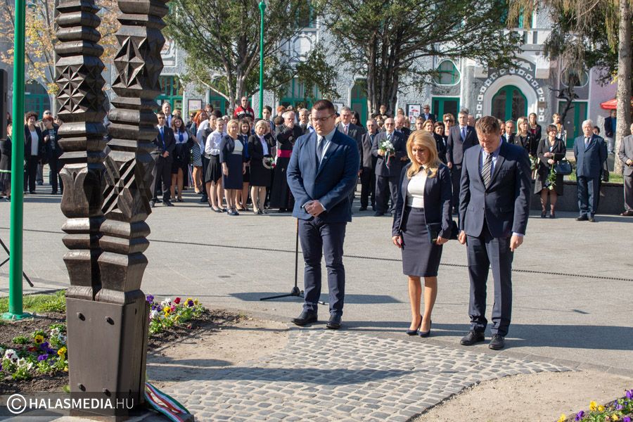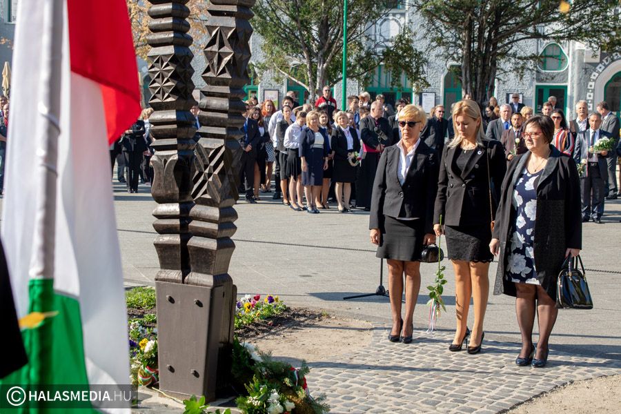 Az ünnepség résztvevői a főtéren álló kopjafánál rótták le kegyeletüket a forradalom áldozatainak emléke előtt.