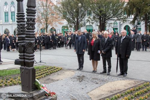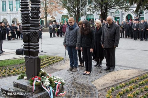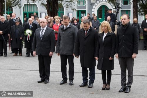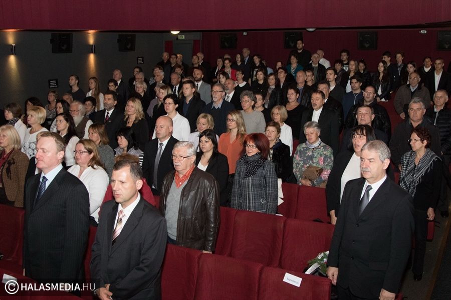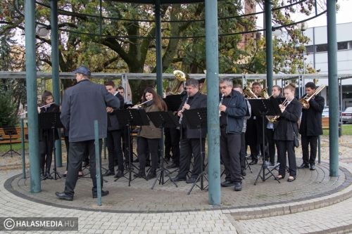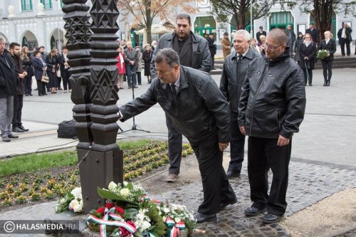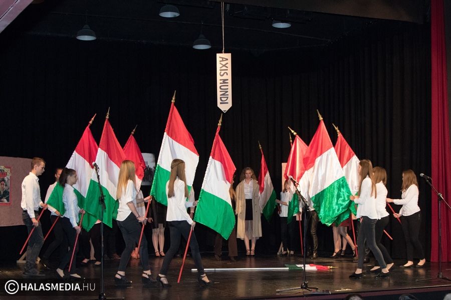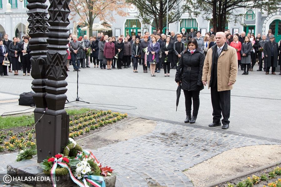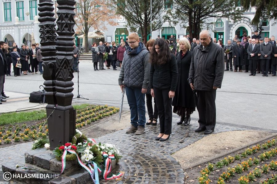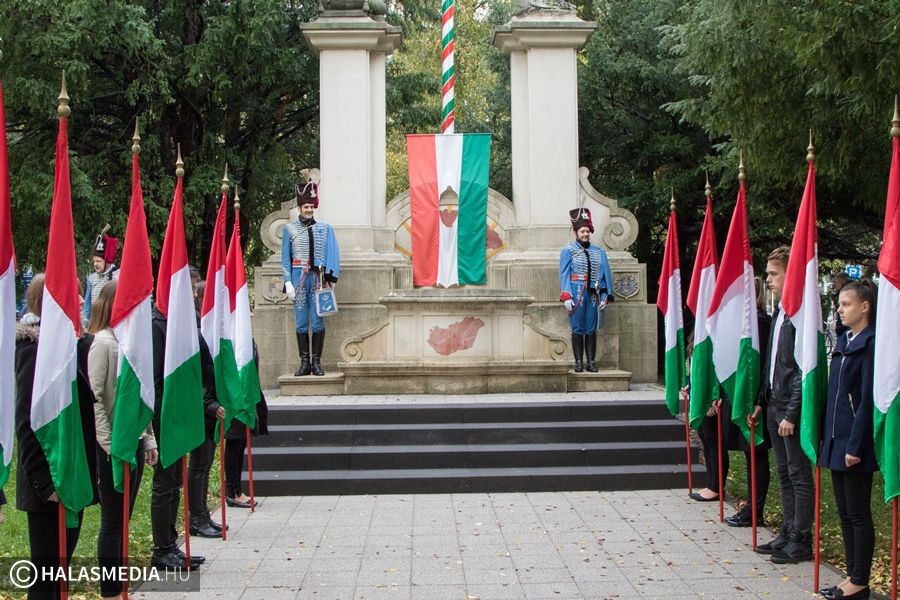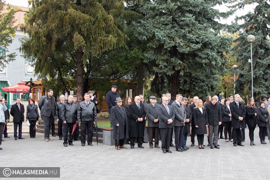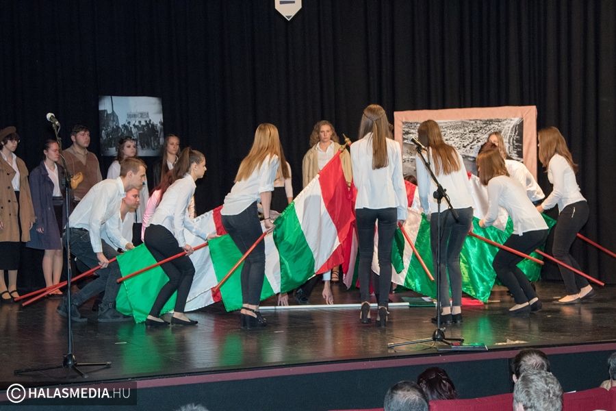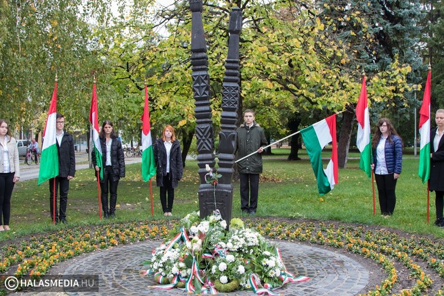 Az országzászló emlékműnél a Halasi Lovas Bandérium tagjai álltak díszőrséget és a Városi Fúvószenekar zenélt a nemzeti lobogó felvonásakor. Az ünnepség résztvevői ezt követően átvonultak a Filmszínházba ahol Bányai Gábor országgyűlési képviselő mondott beszédet. A politikus szerint a forradalmárok egyértelműen kinyilvánították, nem kérnek az elnyomó hatalomból, ha kell, az életük árán megvédik az országot, a függetlenséget. Bányai Gábor szólt a forradalom leverését követő megtorlásokról, a diktatúra vérengzéséről, és a Kiskunhalast is érintő eseményekről.
