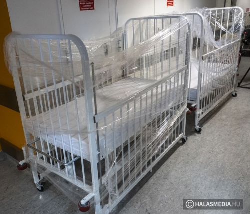 2 db csecsemő ágy (egyedi termék: kétoldali lehúzható rács, infúziós állvány, matrac)