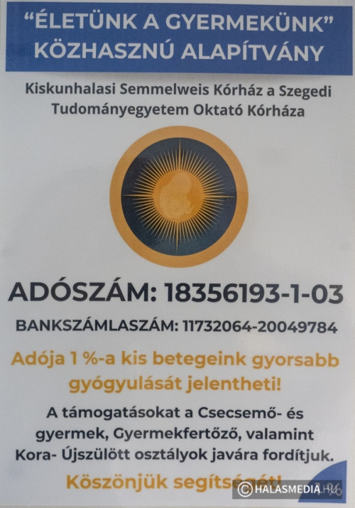 Varga Alajos elnök, többek között elmondta: Az idén már 27 éves a közhasznú alapítványunk. Cél szerinti tevékenysége a gyermekek egészségügyi ellátása színvonalának emelése, a Kiskunhalasi Semmelweis Kórház a Szegedi Tudományegyetem Oktató Kórháza Csecsemő- és gyermek, Gyermekfertőző, Kora-Újszülött osztályai korszerű eszközökkel történő felszerelése, ami elősegíti a gyógyulásukat. A szakdolgozók, orvosok továbbképzésének támogatása is lehetséges az alapítványunk által. Az elmúlt 26 évben több millió forint értékben adtunk át eszközöket az osztályok részére. 2024-es adó 1% bevételünk 1.525 502 Ft volt, amit ezúton is köszönünk a támogatók számára.