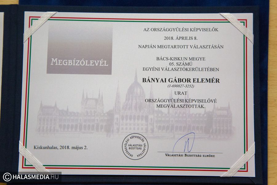 Átvette képviselői mandátumát Bányai Gábor. A térség képviselője a választáson 25536 szavazattal kapott bizalmat a választópolgároktól. A megbízólevelet Dr. Kecskés Patrícia a Választási Bizottság elnöke nyújtotta át a képviselőnek.