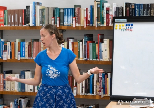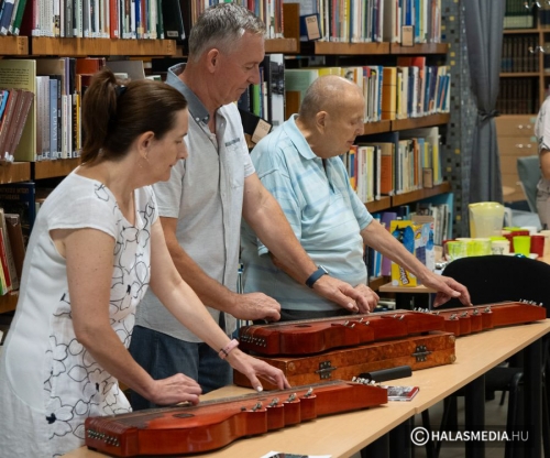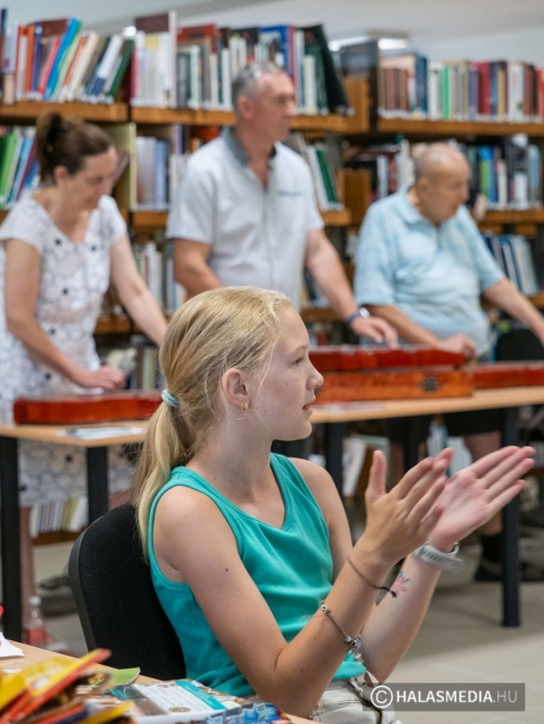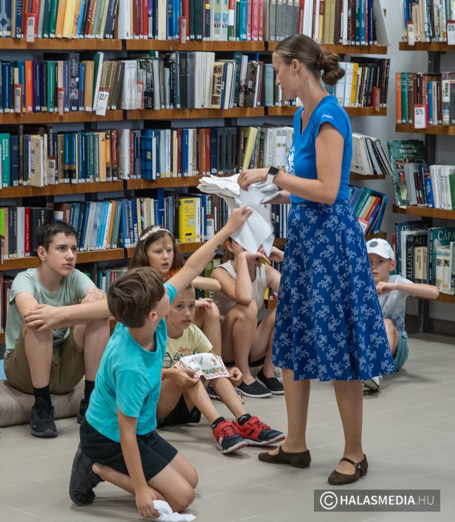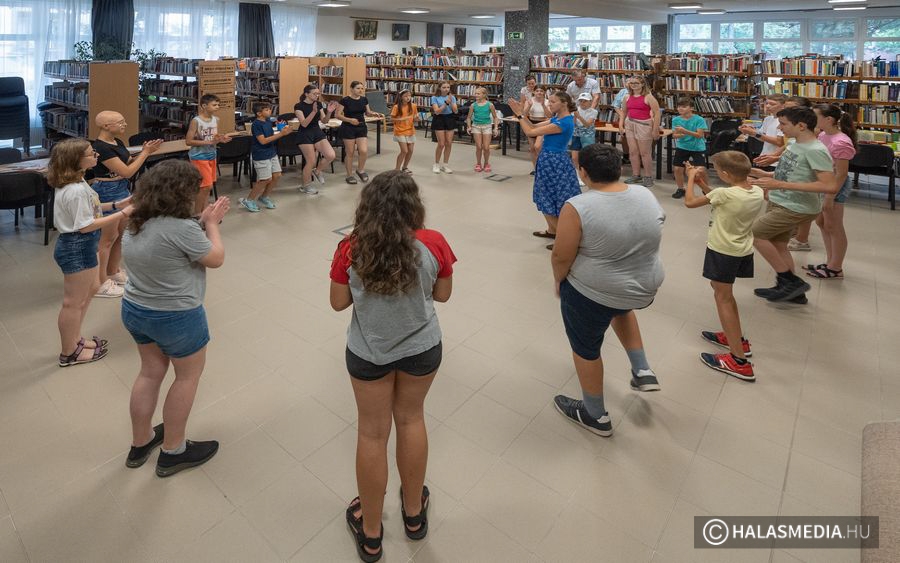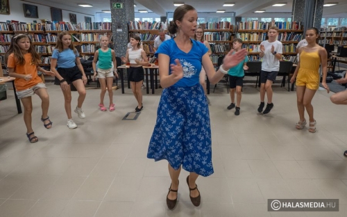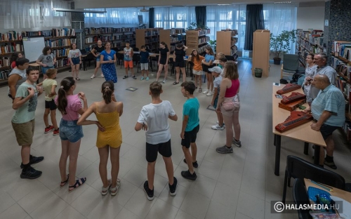 A népi hagyományok felelevenítése, gyakorlása is a tábor részét képezte. Ebben a népijátékos keretben sok segítséget kapunk az „Így tedd rá” tánckör csapatától. Juhász Eszter dinamikus foglalkozásvezetése és a Halasi Népdalkör citerásainak zenei háttere a könyvespolcok labirintusának tisztásán, az olvasóteremben valóságos táncházat varázsolt. A pénteki zárónap csúcspontja, ami még előttünk áll a városnéző kisvasutazás – népszerű nevén a dottó utazás- biztos nagy sikert arat és méltó befejezése lesz az egy hétnek.