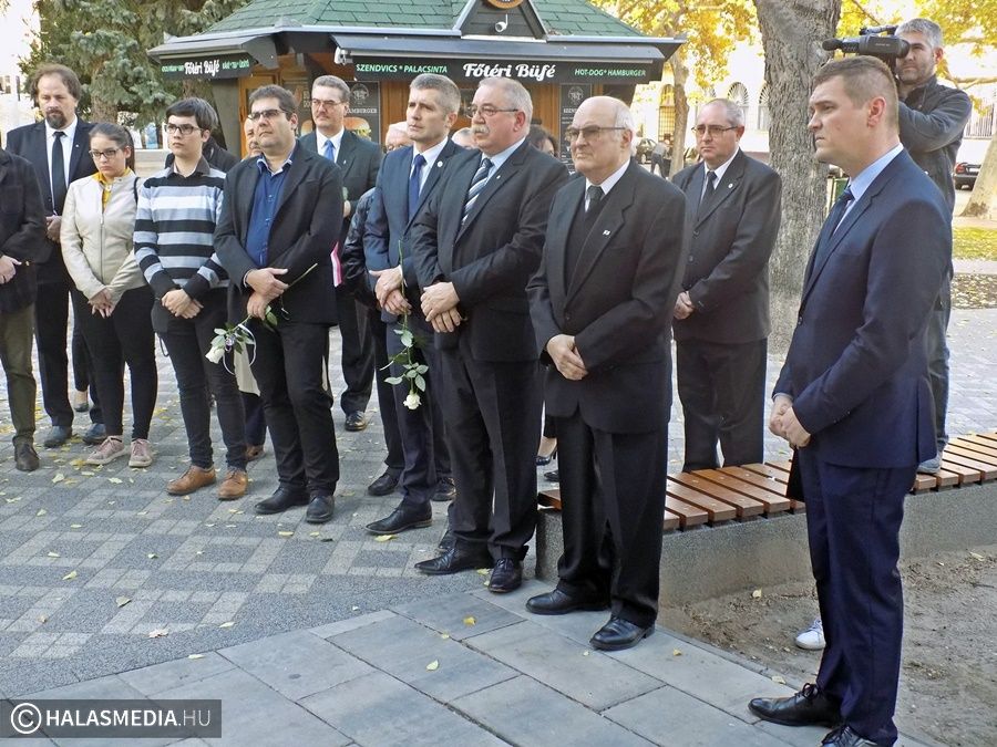 Az összegyűlteket Pajor Kálmán az ’56-os Emlékbizottság elnöke köszöntötte, majd felkérte Makai Imre történelemtanárt, hogy mondjon ünnepi beszédet. A pedagógus a helytörténeti kutatások alapján elmondta, a 62 esztendővel ezelőtti nap a regnáló hatalom félelmét tükrözte, hiszen Miklós Gergely alezredes vezetésével katonai közigazgatás jött létre, másrészt a város lakosságának az együttműködő készségét fejezi ki, mert közel háromezer fős tömeg vonult az első világháborús szoborhoz, hogy közösen emlékezzen.