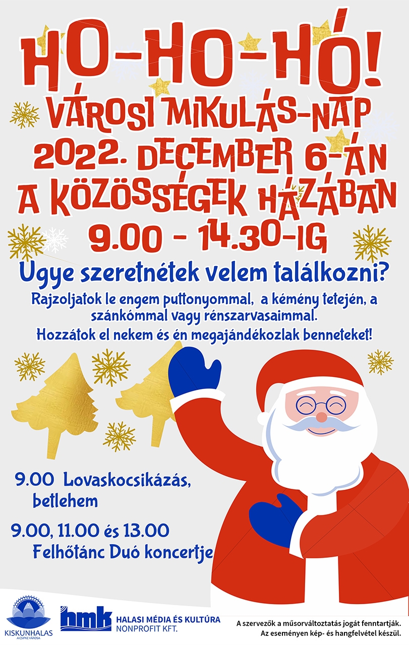 December 6-án a Közösségek Házába érkezik a Mikulás. A városi Mikulás napot szervező Halasi Média és Kultúra Kft. csapata várja azokat a gyerekeket, akik találkozni szeretnének a Mikulással. Aki rajzot hoz a nagyszakállúnak, ajándékot kap.