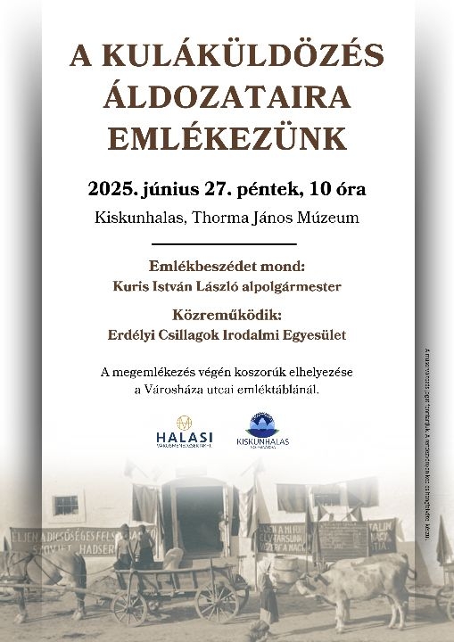 A kuláküldözés áldozataira emlékezünk június végén. Kiskunhalason június 27-én, pénteken délelőtt 10 órakor kezdődik a városi megemlékezés a Thorma János Múzeumban a Halasi Városmenedzser Nonprofit Kft. szervezésében.
