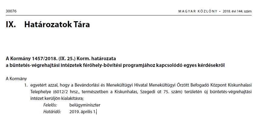A most megjelent Magyar Közlöny számol be arról, hogy a Kormány büntetésvégrehajtási intézet kialakítását szorgalmazza Kiskunhalason, a Szegedi úton, a korábbi Őrzött Befogadó Központ telephelyén.