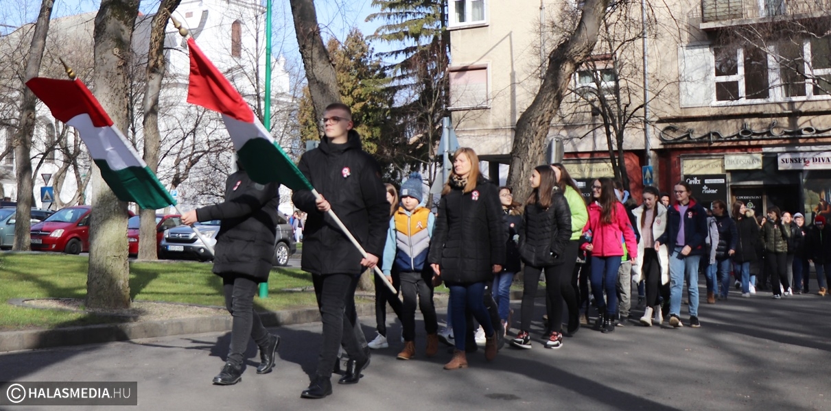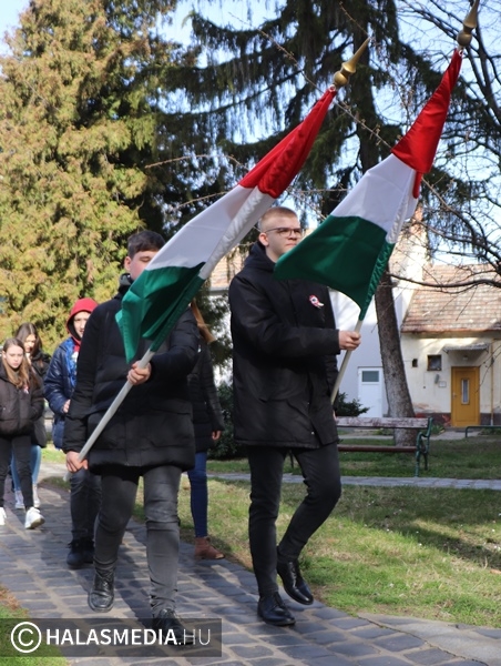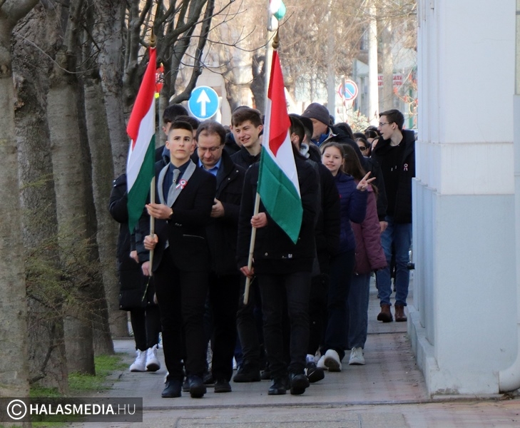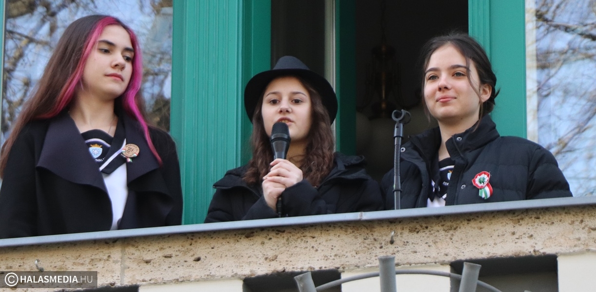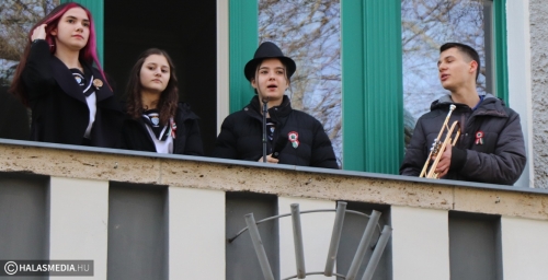 Szokásos hétfő reggelként indult a március 13-a a Szilády Áron Református Gimnázium diákjai, pedagógusai számára. A hétkezdő áhítaton Arany-Michels Tímea lelkész igehirdetését hallgathatták meg a jelenlévők a templomban. A folytatás viszont rendhagyó volt. Palásti Károly, a gimnázium pedagógusa nem szereti a sablonos ünnepségeket. Mindig kitalál valami olyat, amely még közelebb viszi a diákokhoz, a fiatalokhoz az adott ünnep üzenetét. Így volt ez a közelgő március 15-e kapcsán is. A rendezvényt kihozta az iskola falai közül. Az áhítatot követően a tanulók együtt, zászlók előtt sétáltak át a városházához, ahol a polgármesteri erkélyről trombitaszó, és szavalat fogadta őket.