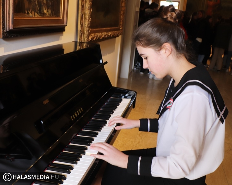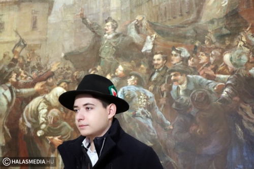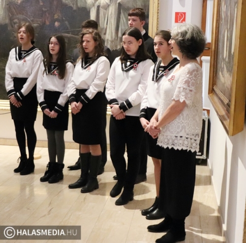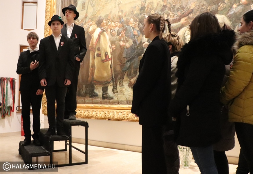 A történelmi, és irodalmi flashmob a Thorma János Múzeumban folytatódott, a Talpra magyar című festmény előtt fiatal Petőfik várták az érkezőket, míg az iskola énekkara, Andáné Vastag Andrea tanárnő vezetésével stílusos dalokkal készült. A program végén elhelyezték a megemlékezés virágait a monumentális festmény előtt. - Igyekszem a műsorokat mindig játékká tenni. Erről szólt a kalap, a tanítványom Darányi Aisa meghorgolta a kokárdákat. Azzal is próbáltunk újítani, hogy a zöld szín volt kívül a kokárdán. A zászló olvasásban felülről haladok lefelé, a kokárda esetében pedig a középről kifelé. A Mátyás-huszárok annak idején így viselték ezt a jelképet- fogalmazott Palásti Károly.