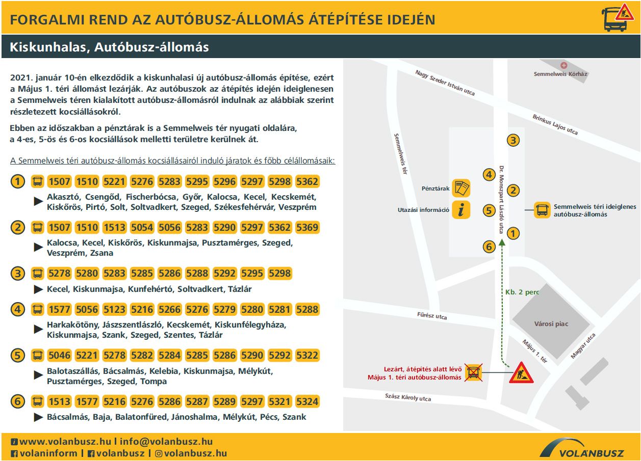 2021 folyamán megújul a kiskunhalasi autóbusz-állomás. Az újjáépítés ideje alatt, 2021. január 10-től a jelenlegi helyszín közelében, a Semmelweis téren kialakított ideiglenes állomáson vehetik igénybe a járatokat és a szolgáltatásokat a Volánbusz utasai.