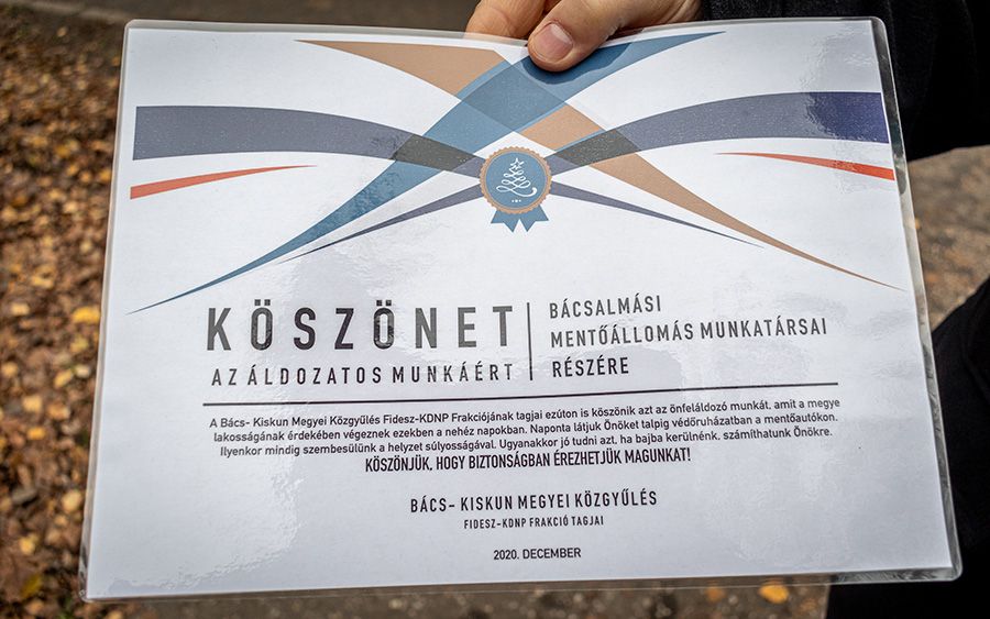 A Bács- Kiskun Megyei Közgyűlés Fidesz-KDNP Frakciójának tagjai ezúton is köszönik azt az önfeláldozó munkát, amit a megye lakosságának érdekében végeznek ezekben a nehéz napokban. Naponta látjuk Önöket talpig védőruházatban a mentőautókon.