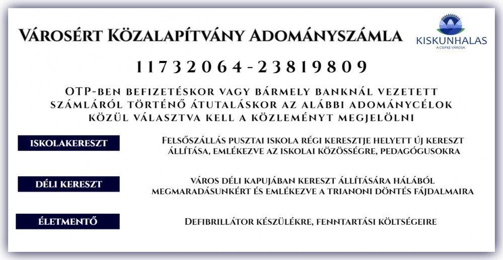 A Városért Közalapítvány egy adományszámlát nyitott, a fenti célokat az OTP-ben történő befizetéssel vagy átutalással lehet támogatni.