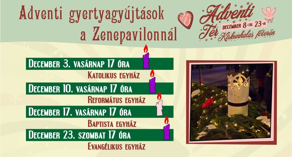 Vasárnap délután ünnepváró programra várjuk a halasiakat a főtérre. A Zenepavilonnál egy hatalmas adventi koszorú készül, december 3-án, 17 órától a katolikus egyház közreműködésével lobban majd fel az első láng a gyertyán. Ezt követően december 10-én, valamint 17-én és rendhagyó módon, december 23-án szombaton lesz hasonló program.