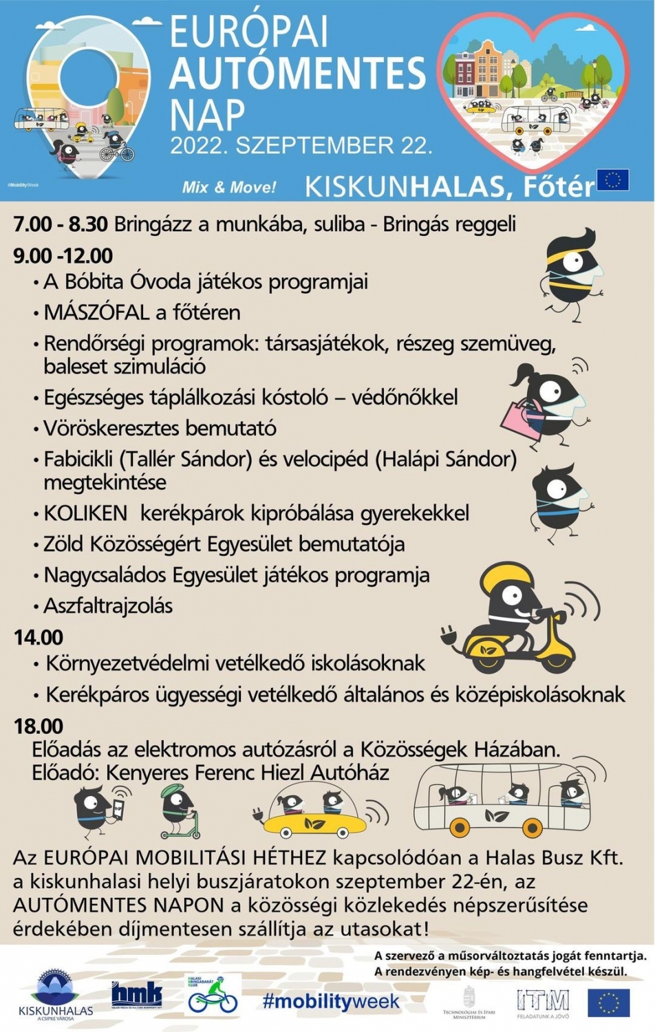 Szeptember 22-én, csütörtökön van az Európai autómentes nap. Halas főterén reggel 7 órától bringás reggeli – kakaós csiga - várja az iskolába, munkába kerékpárral indulókat.