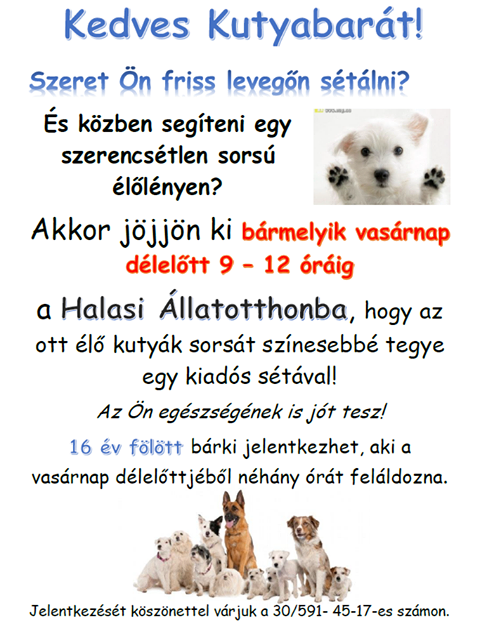 Egy kiadós sétával szebbé tehetik a Halasi Állatotthonban lévő kutyák életét. Önkéntesek segítségét kérik az önkéntes állatvédők. Az otthonban jelenleg közel ötven állatot gondoznak, a mindennapi megfelelő mozgásmennyiség miatt gyakran kell sétáltatniuk őket.