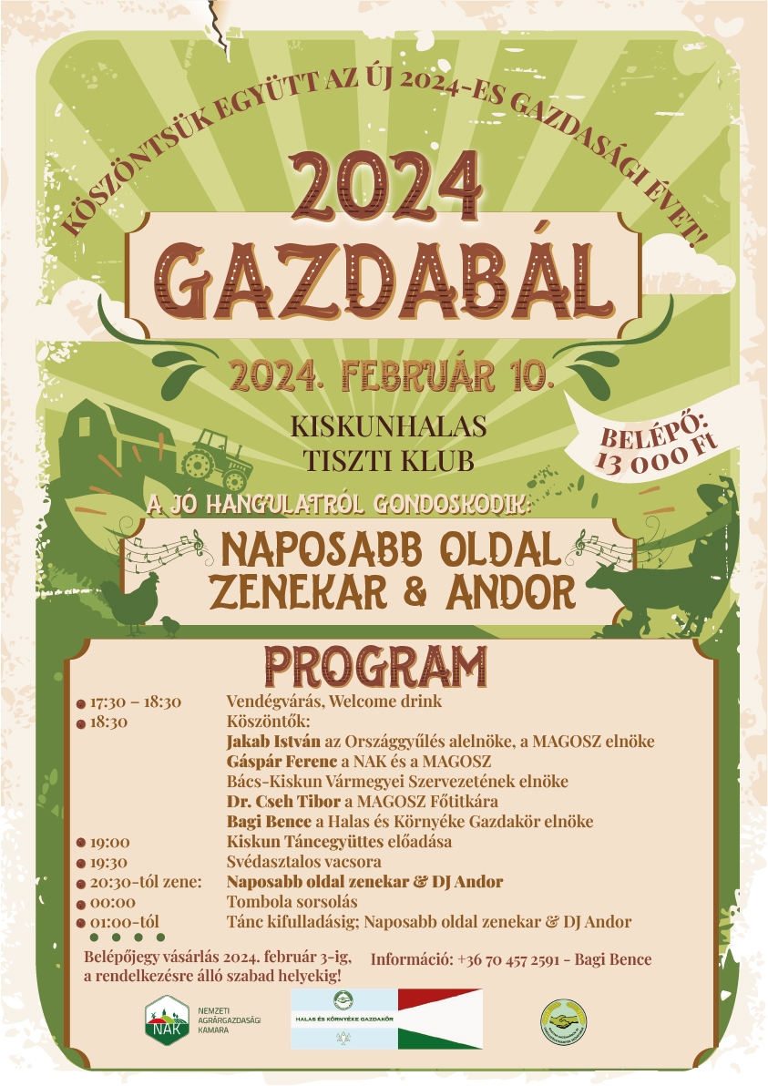 A hagyományos Gazdabálra Kiskunhalason az idén február 10-én kerül sor. Az estre 17.30 órától várják a vendégeket. Az eseményen részt vesz és köszöntőt mond Jakab István az Országgyűlés alelnöke, a MAGOSZ elnöke, Dr. Cseh Tibor András, a Magosz főtitkára, Gáspár Ferenc, a Nemzeti Agrárgazdasági Kamara Bács-Kiskun Vármegyei Szervezetének elnöke és Bagi Bence, a Halas és Környéke Gazdakör elnöke.
