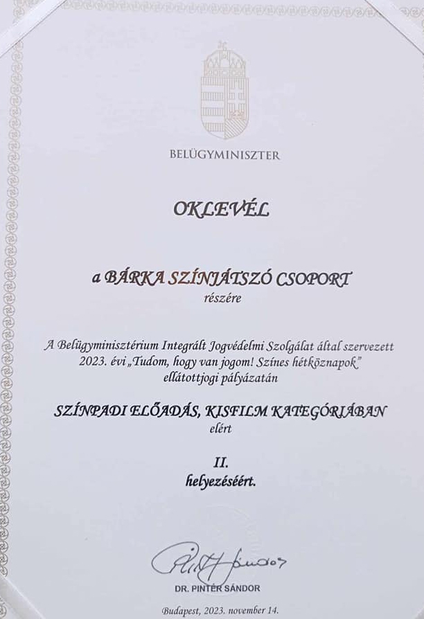 "Tudom, hogy van jogom! Színes hétköznapok 2023" országos ellátottjogi pályázaton II. helyezést ért el a Bárka Színjátszó-Filmes Csoport. Az ünnepélyes díjátadóra a Belügyminisztériumban került sor kedden. A fővárosban, a már korábban is több díjat bezsebelő Bárka Integrált Szociális Intézmény színjátszó-filmes csoportja megint a „Harmadnap” című filméjével érte el a sikert a „Színpadi előadási kisfilm” kategóriában. A díjat az alkotók vették át.