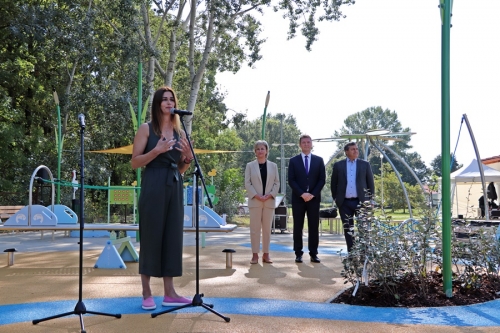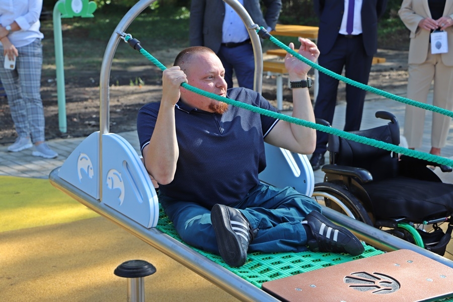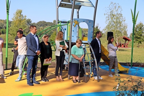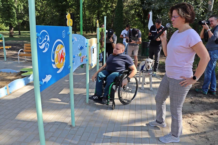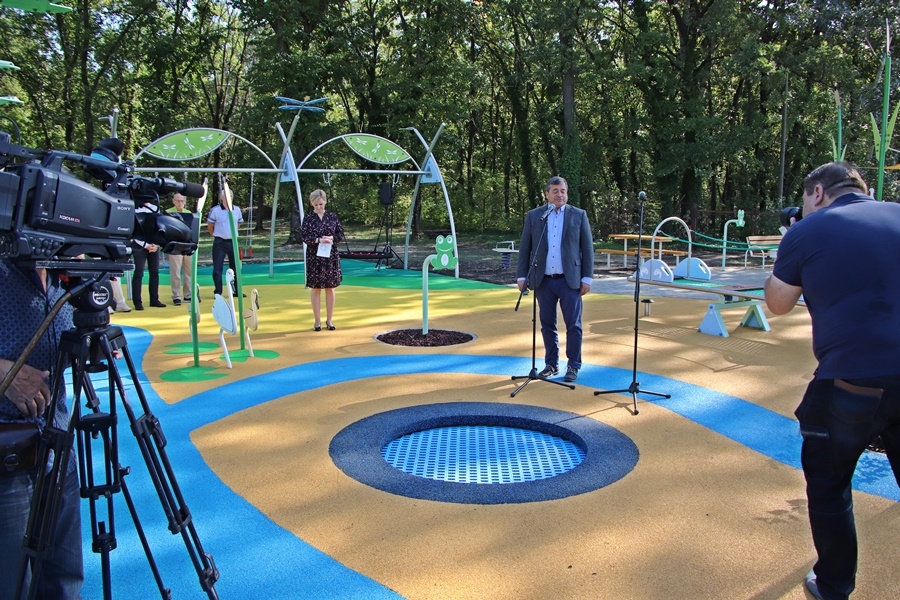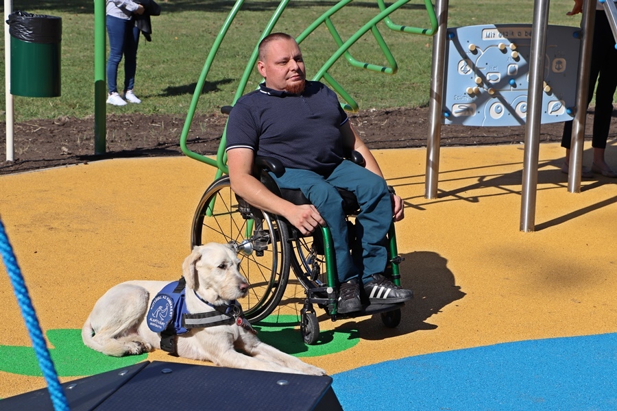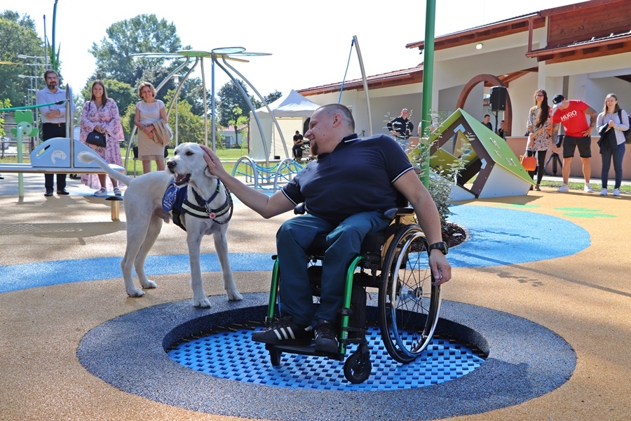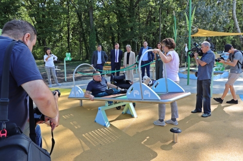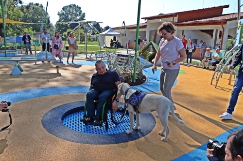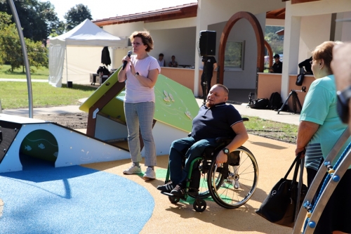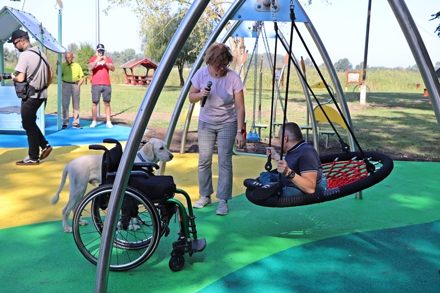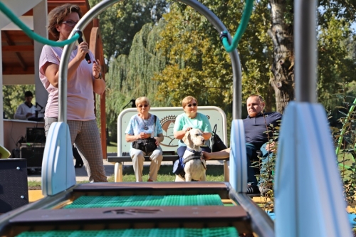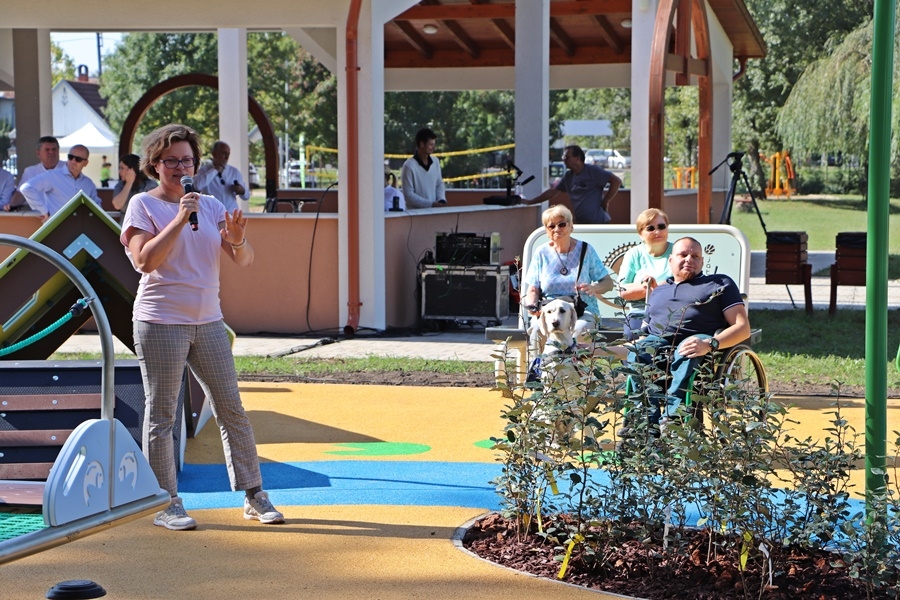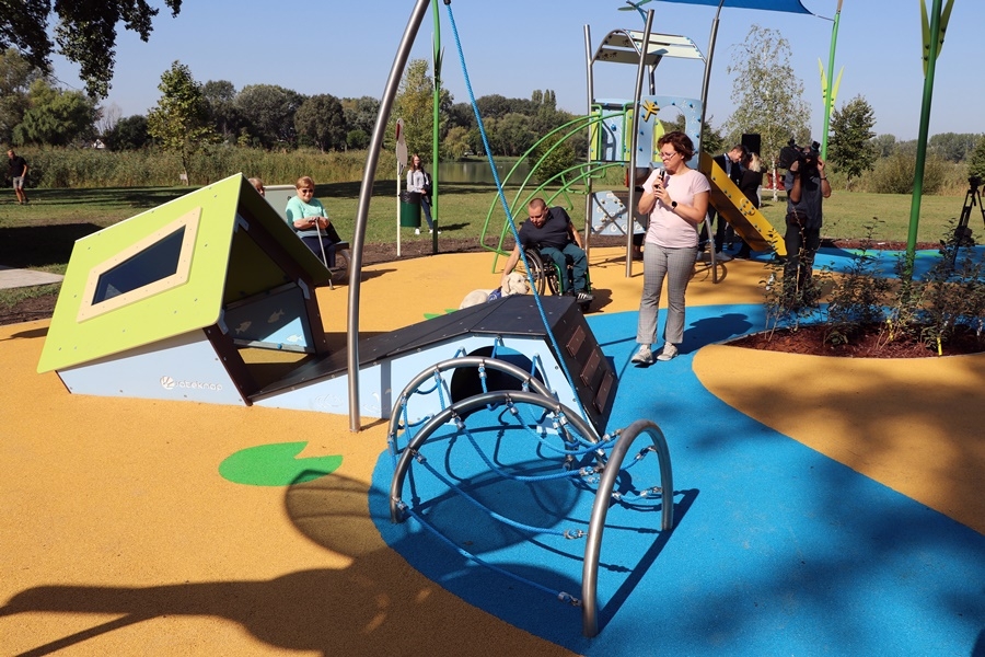 Fördős Hódi Erzsébet építész, rehabilitációs szakmérnök és Tóth Zoltán tapasztalati szakértő tartott bemutatót az új befogadó játszótéren, közösen szemléltették azt is, hogy az egyes játékelemek között a kerekesszékkel, önállóan segítség nélkül lehet közlekedni.
