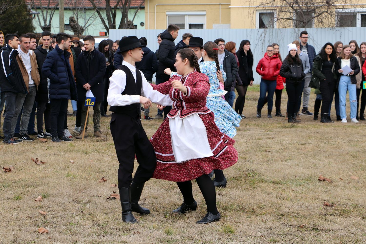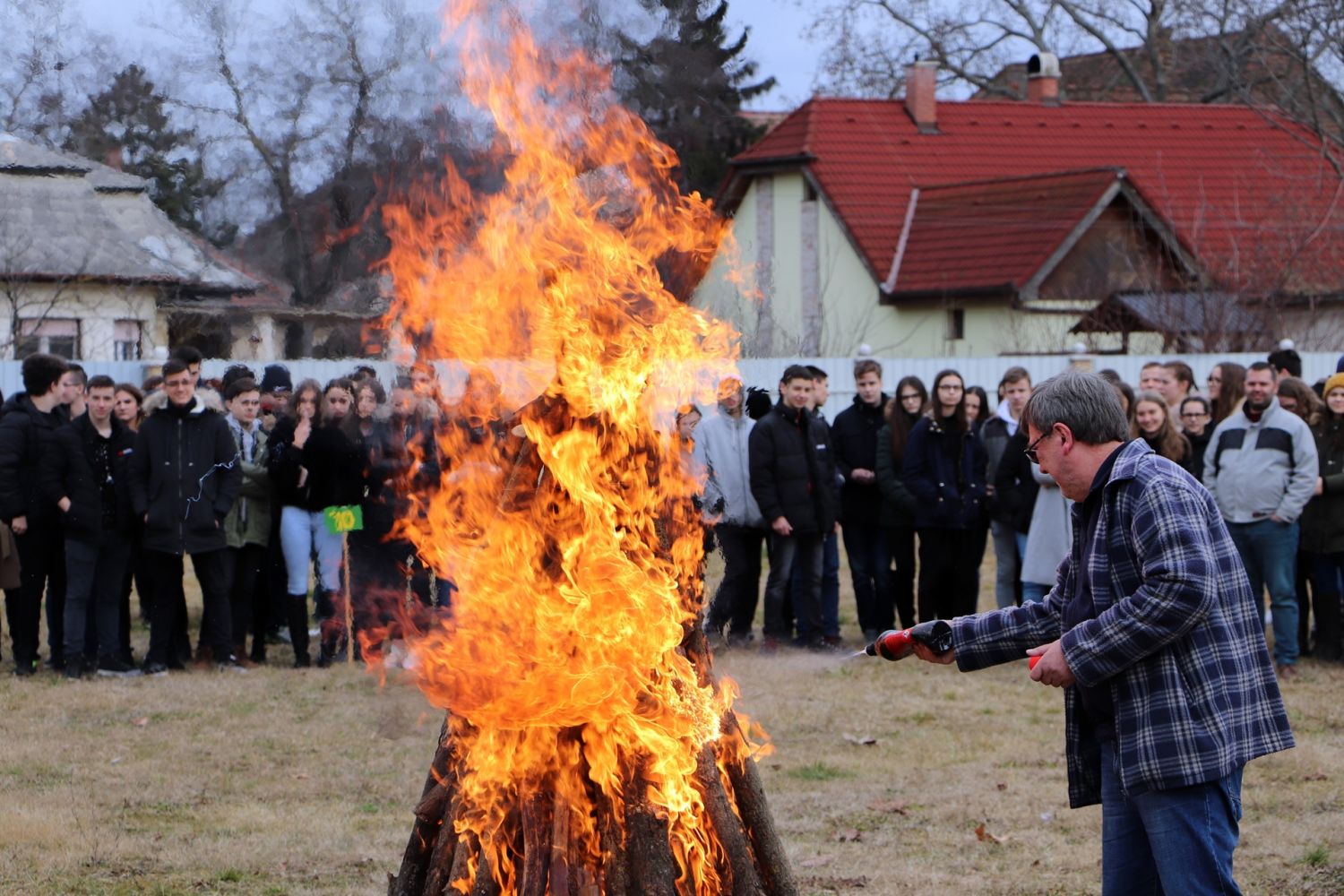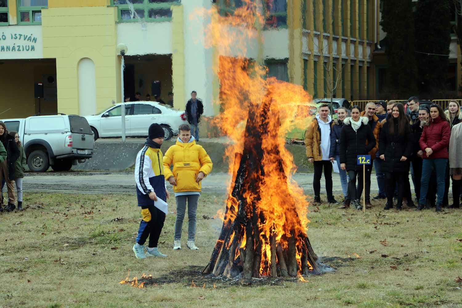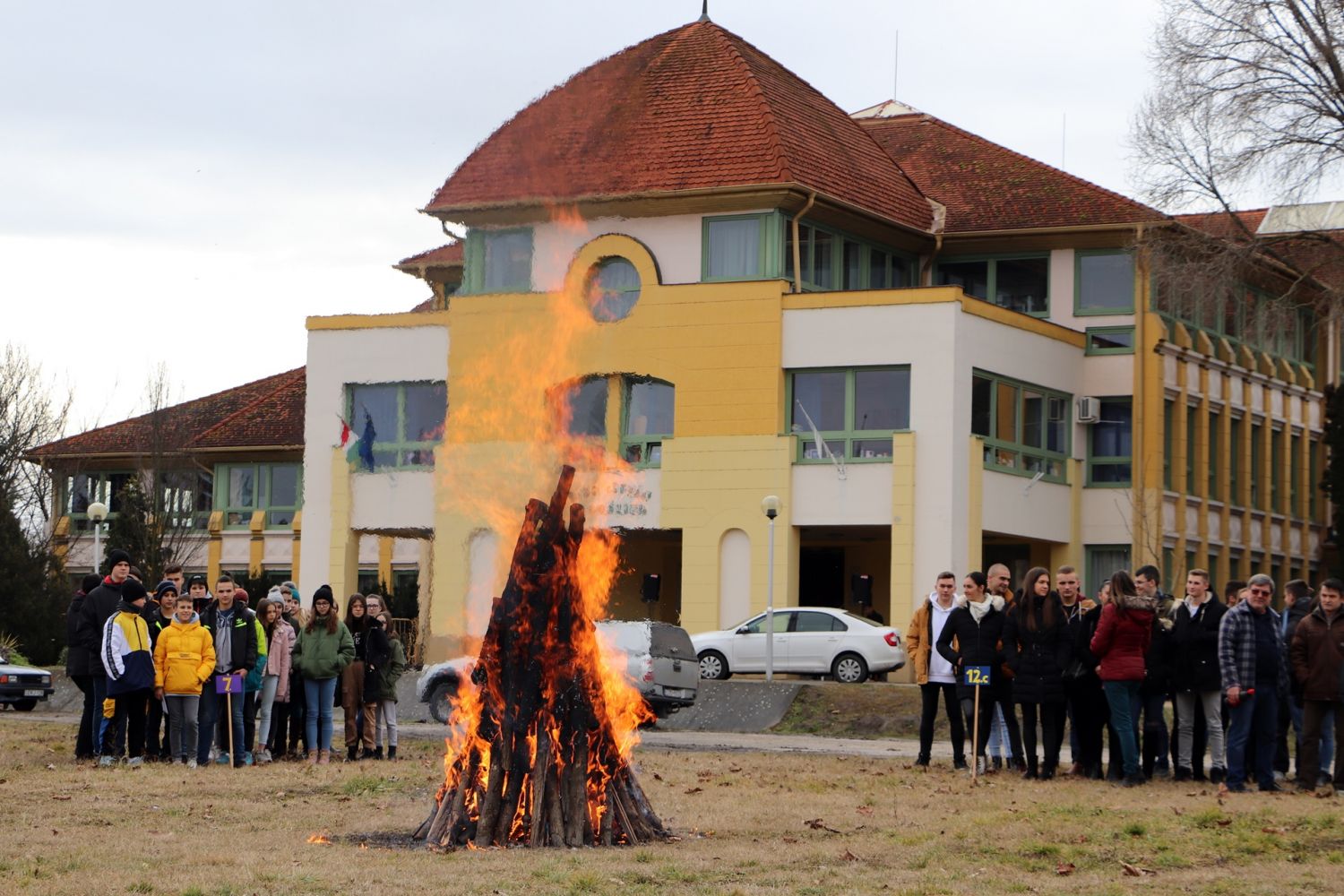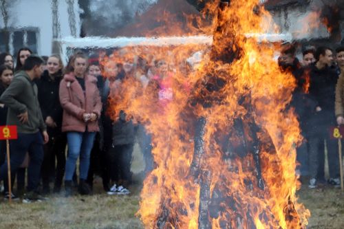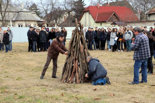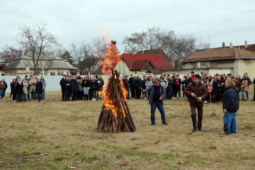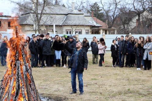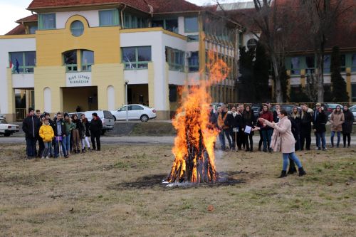 A vidám télűzés népi tánccal kezdődött, majd begyújtották a parkolóban felállított máglyát. Ezt megelőzően a diákok egy-egy cetlire felírták mind azt, amelytől meg szeretnének szabadulni. A gondolatok borítékokba kerültek és az osztályok képviselői ezt dobták be a tűzbe.