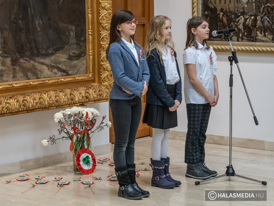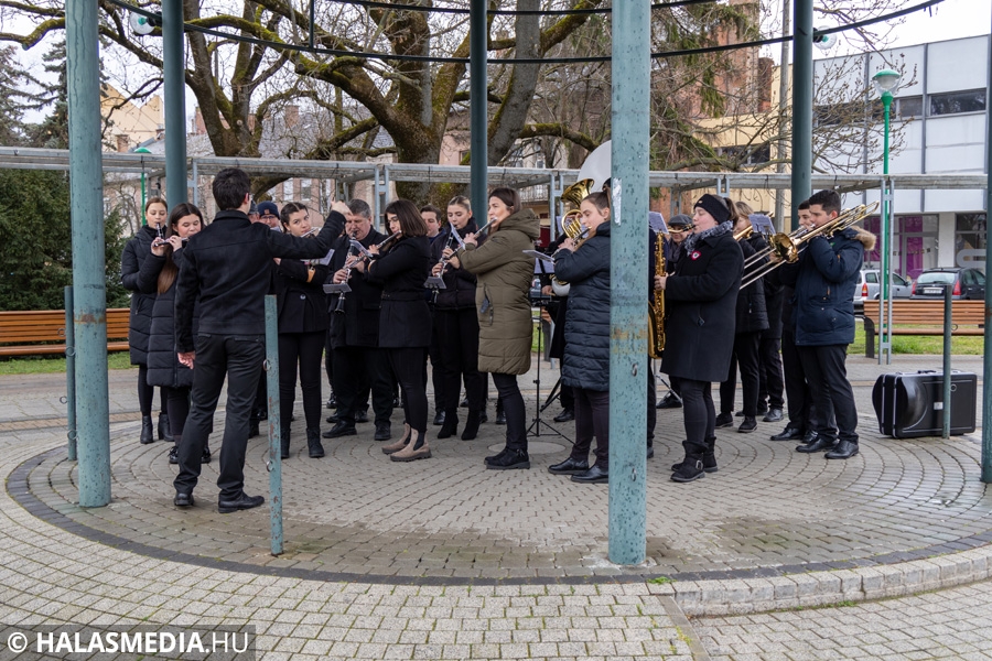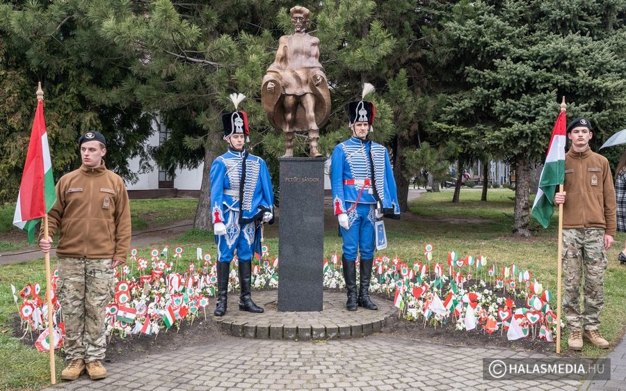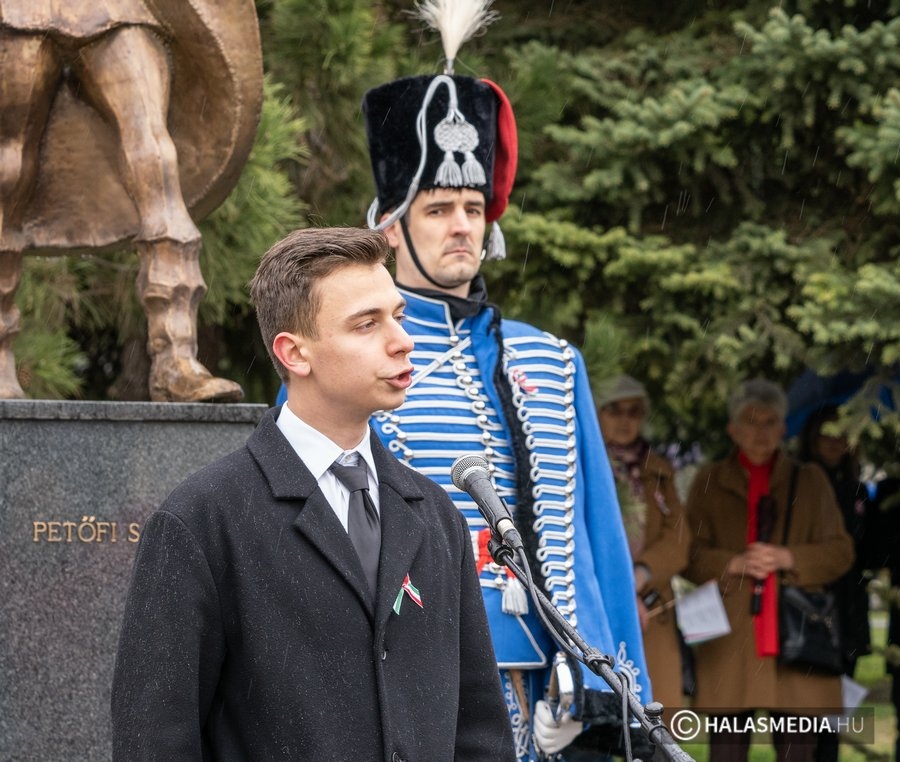 A Petőfi szobor nemzeti színű zászlókkal övezett gyűrűje köré sokan összegyűltek, ahová a szomszédos Magyarok Vásárából is odalátogattak érdeklődők. A szobornál közös szavalás következett. Petőfi Sándor Nemzeti Dal című költeményét a versmondó, Görög Bence segítségével szavalta el a tömeg. A versmondást követően a Halas Concert Band zenés kísérete közben történt az emlékezés virágainak elhelyezése, amellyel a város hivatalos ünnepségsorozata befejeződött.