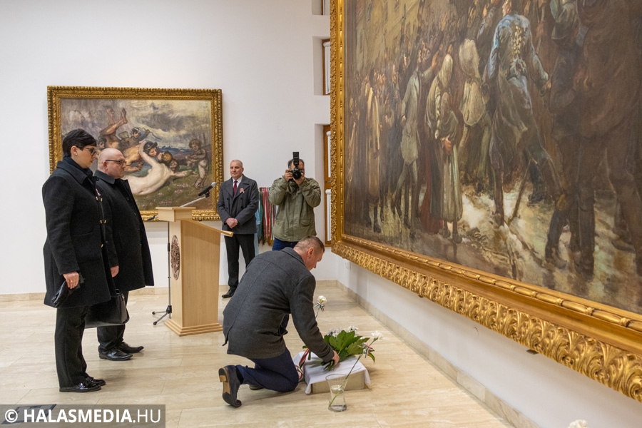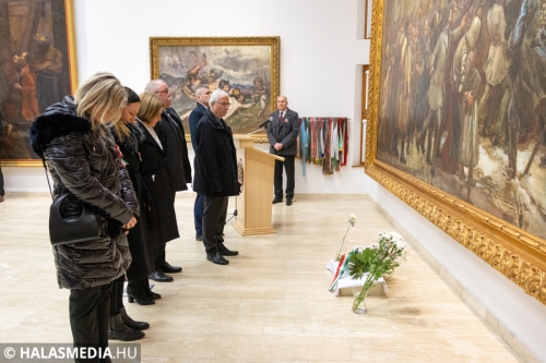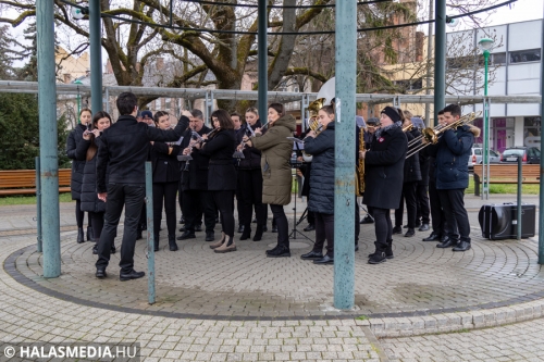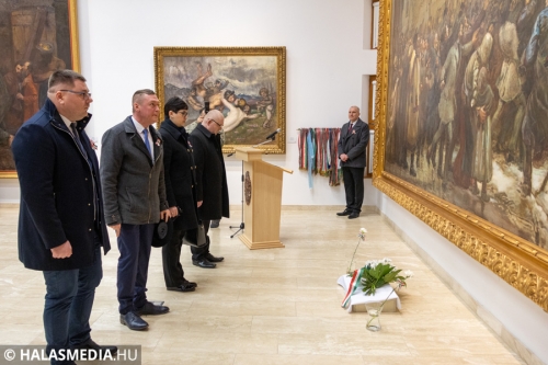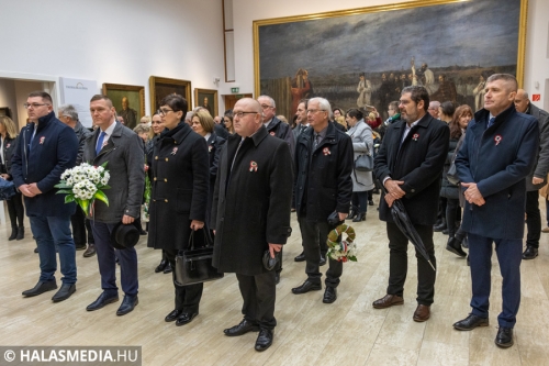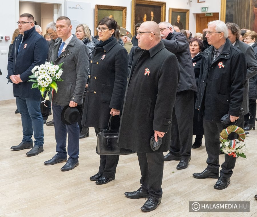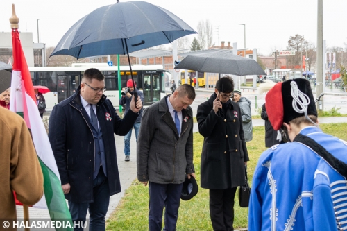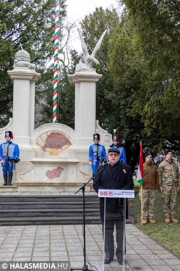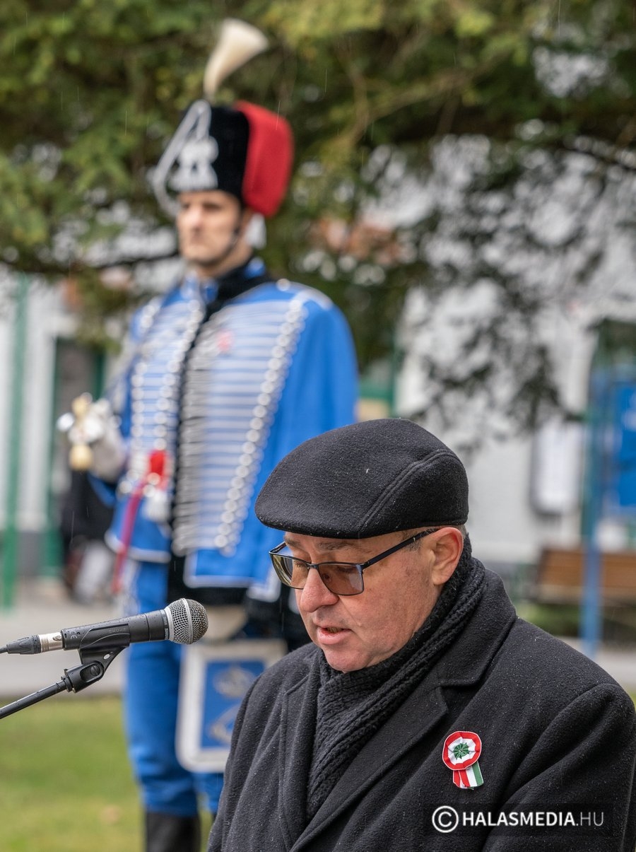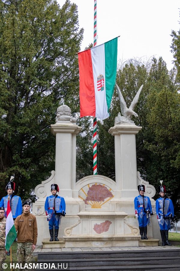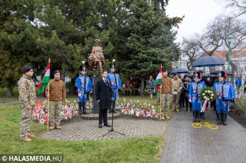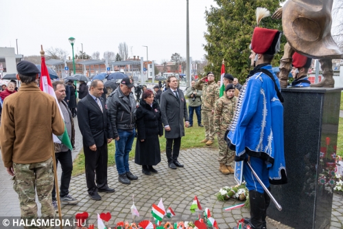 Az indító huszárvezényszó után a Halas Concert Band által előadott Himnusz hangjaira az emlékmű zászlórúdjának csúcsára vonták a nemzeti lobogót. Városvezetők, kiskunhalasi önkormányzati képviselők, társadalmi szervezetek, intézmények vezetői, képviselői és halasi polgárok jelenlétében Hunyadi Péter képviselő lépett a szónoki mikrofonhoz beszédet mondani.
