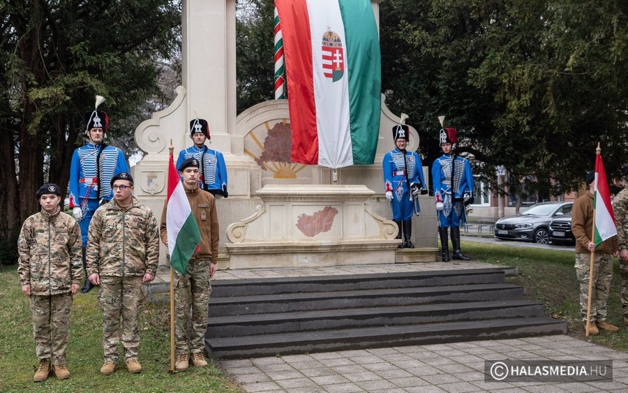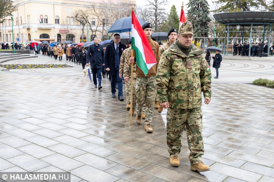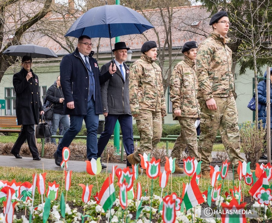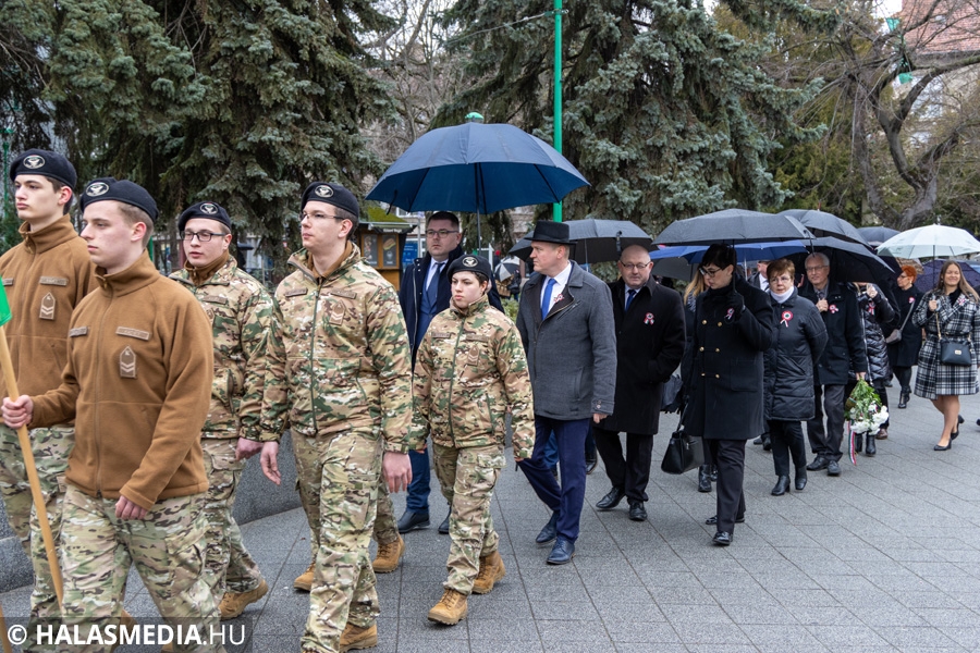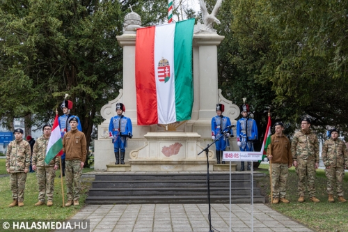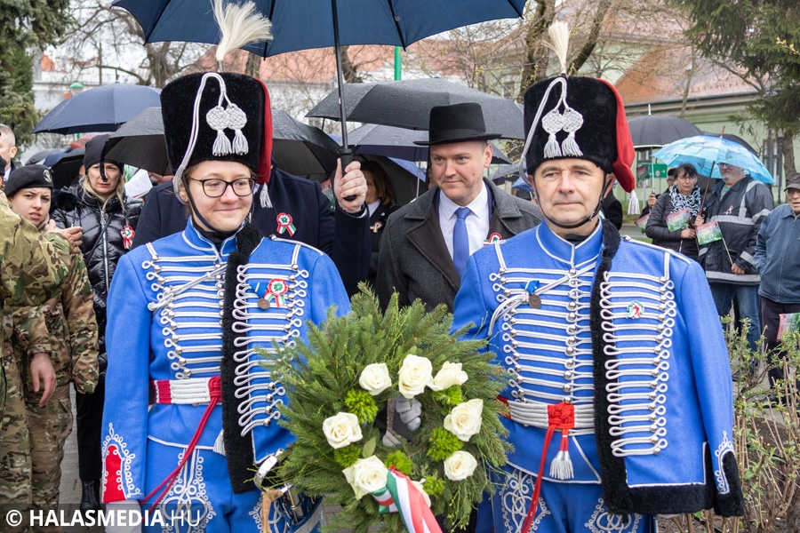 Jellemzően esernyők alól figyelték a jelenlévők az 1848–49-es forradalom és szabadságharc kiskunhalasi ünnepségét szerdán délelőtt 10 órától a Városmenedzser Kft. által szervezett városi ünnepségen. A helyi emlékező eseménysor első állomása az Országzászló emlékműnél a Kiskunhalasi Lovasbandérium díszelgő huszárjai és a Kiskunhalasi SZC Dékáni Árpád Technikum kadétjai sorfala előtt kezdődött.