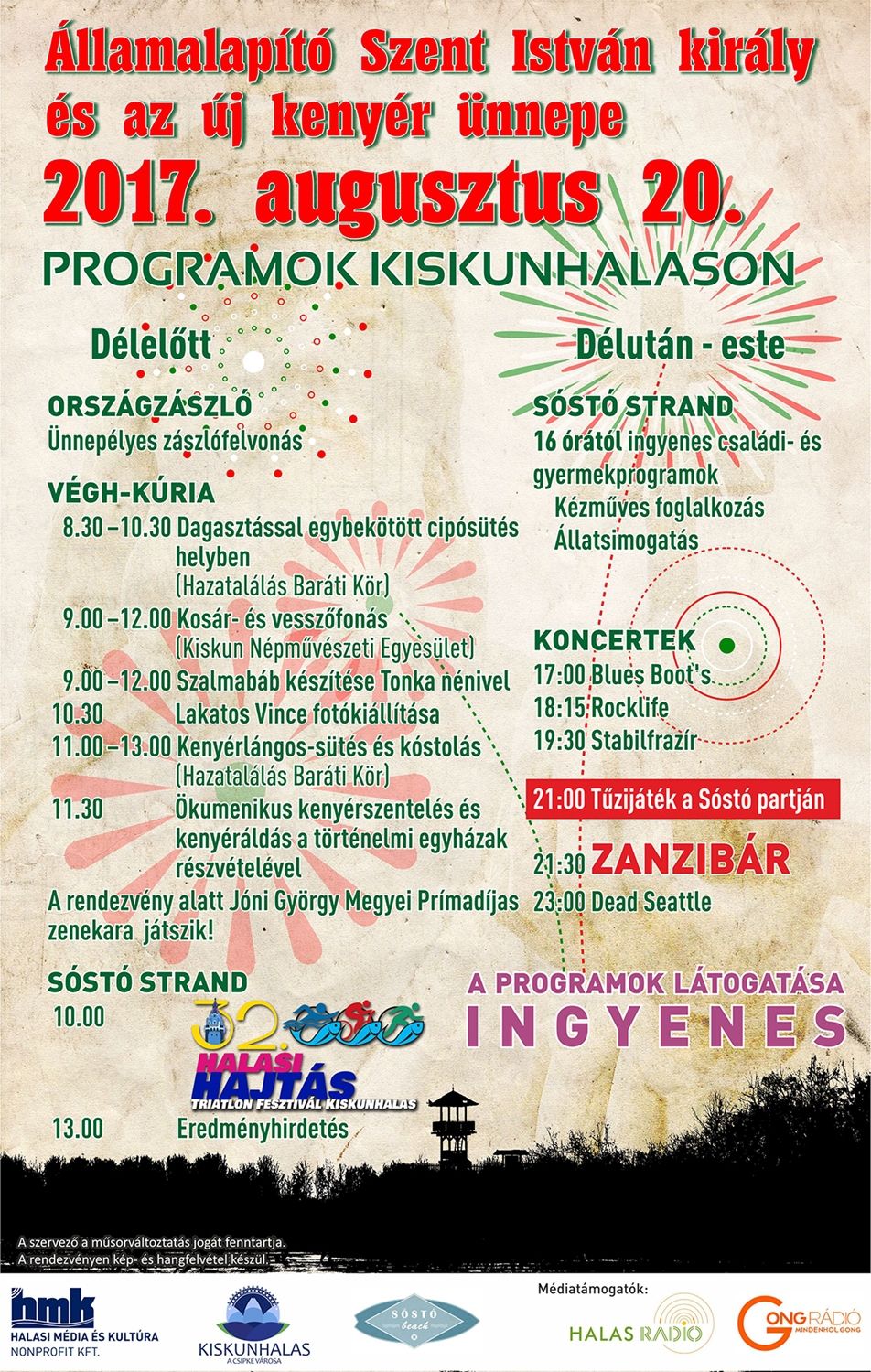 A Sóstónál sportosan telik az augusztus 20-a délelőttje. 10 órakor rajtol a 32. Halasi Hajtás Triatlon Fesztivál mezőnye (Regisztráció és információ itt). A Sóstóbál délután 16 órától családi és gyermekprogramok kezdődnek. 17 órától már a zenekarok- Blues Boot’s, Rocklife, Stablifrazír - is a húrokba csapnak.