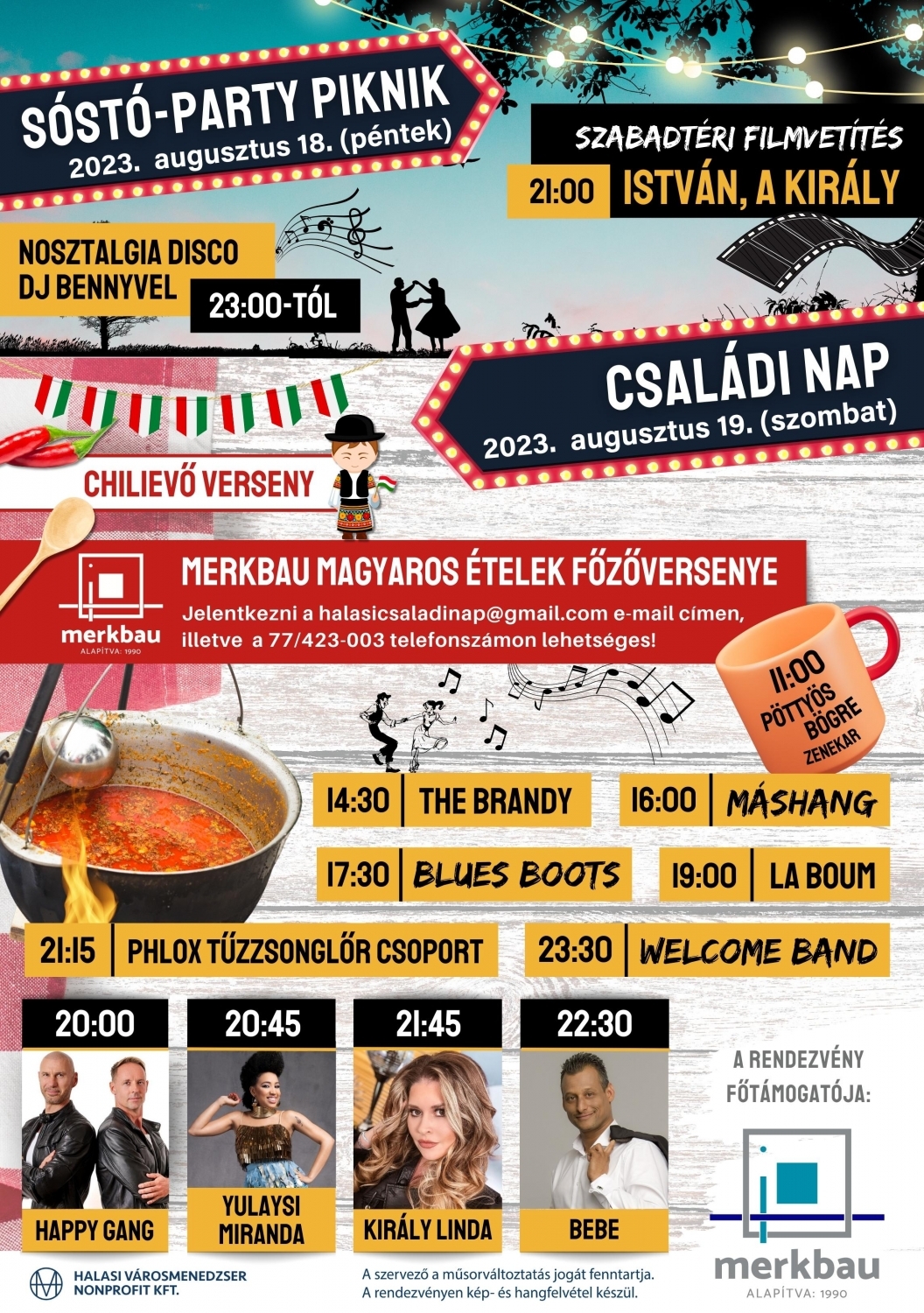 Zavarba ejtően sok program vár a halasi és környéki polgárokra Kiskunhalason az ünnepi hétvégén. Péntek este kertmozizás és szabadtéri disco a Sóstón, másnap főzőverseny, kulturális programok és koncertek sora a kedvelt városszéli kiránduló központban. Vasárnap formális augusztus 20-i ünnepségek a főtéren, majd a Végh-kúriában. Egyébként pedig háromnapos díjugrató verseny lesz a Hirling Lovasparkban. Részletekről az alábbiakban, tessék szemezgetni!