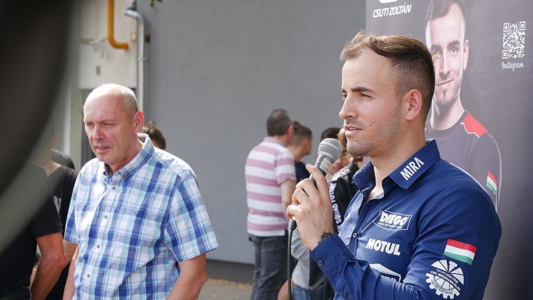 Megtelt az iskola udvara az érdeklődőkkel pénteken délelőtt, sokan kíváncsiak voltak a halasi bajnokra és a versenyjárművére. Csuti Zoltánt a Gépész Munkacsoport vezetője Somogyvári József mutatta be a diákoknak. Mint mondta, egy igazi példakép áll itt előttük, aki kitűzte maga elé a célt és meg is tett mindent, hogy elérje azt.