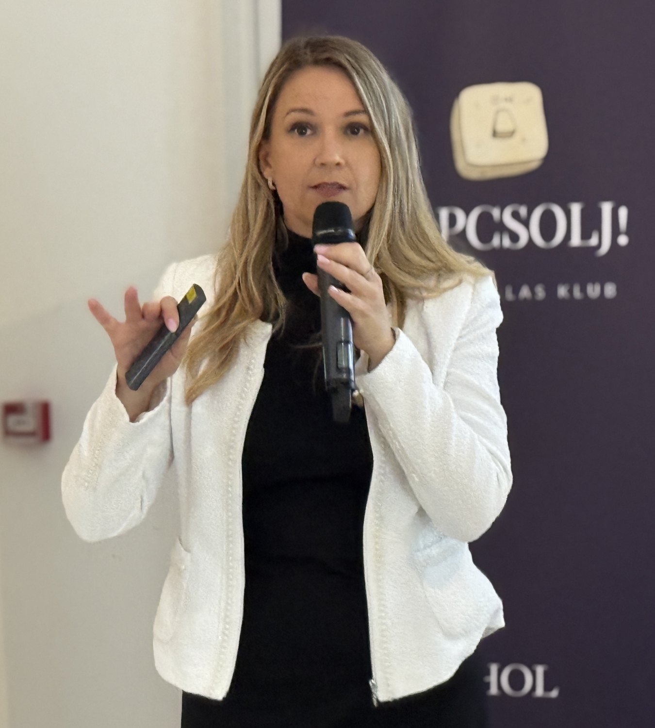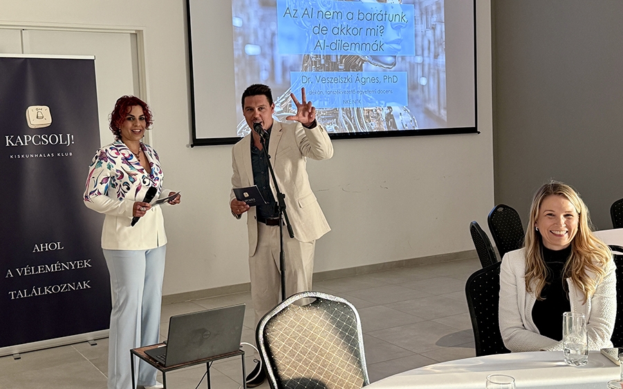 2025. szeptember 19-én a Kincsem Házban mintegy ötven fős érdeklődő közönség hallgathatta meg Veszelszki Ágnes (címképen) magyar nyelvész, kommunikációkutató, egyetemi oktató lebilincselő előadását Az AI nem a barátunk, de akkor mi? AI-dilemmák címmel. A rendezvényt a közelmúltban alakult Kapcsolj Kiskunhalas Klub szervezte, amelynek ez volt az első aktivitása, azt ígérték lesz folytatása.
