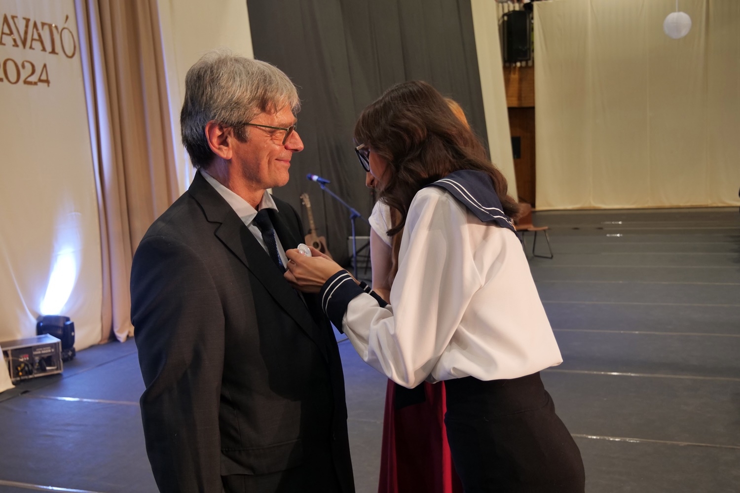 Az igazgató zakójára Ádám Hedvig Dorka tűzte fel a szalagot, a Dékáni Technikumban hagyomány, hogy a legjobb teljesítményt nyújtó fiatalok az igazgatótól kapják meg a díszes kitűzőt.