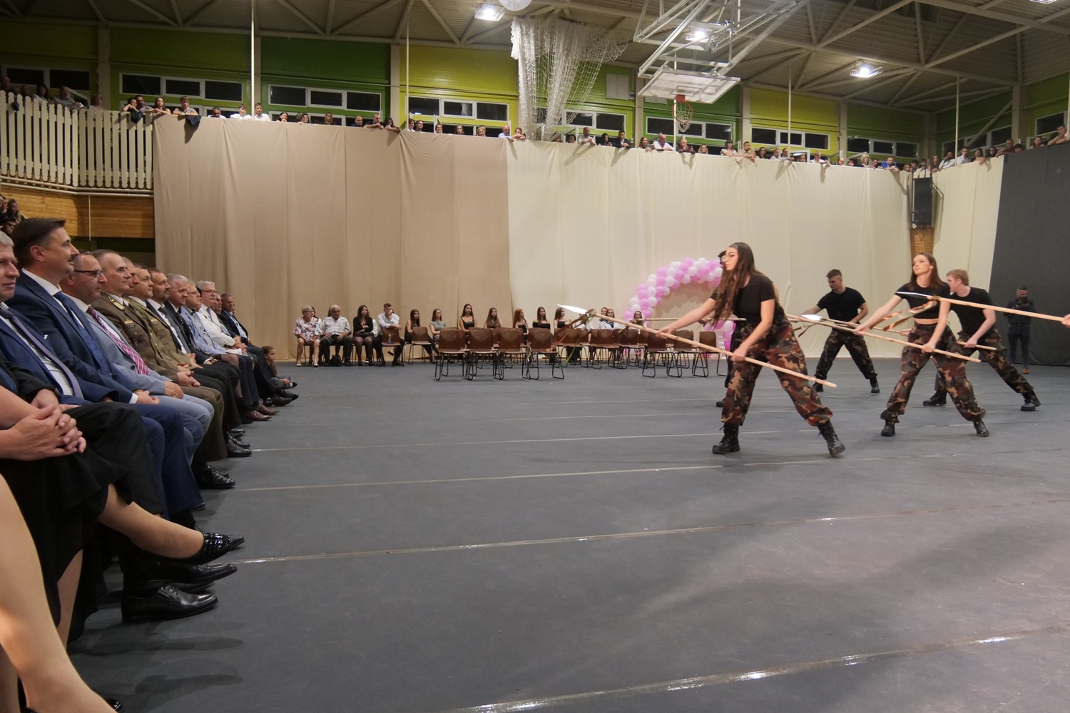 A kadétok, karddal, lándzsával a kezükben masíroztak be a sportcsarnokba. A 13.C osztály szakmájának megfelelően példás fegyelemmel mutatta be Vida Jácint koreográfiáját.