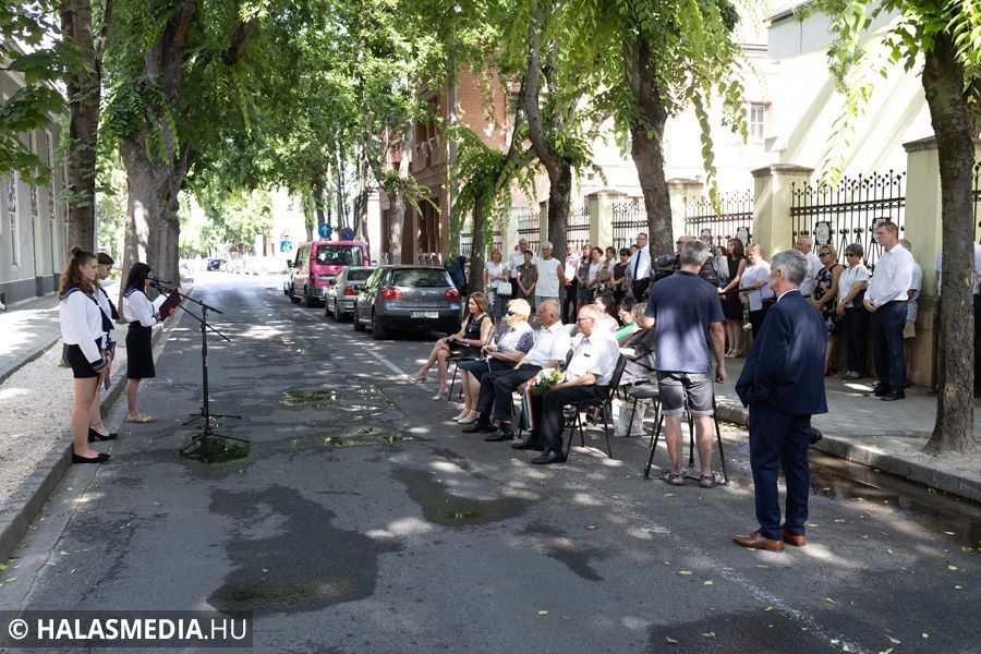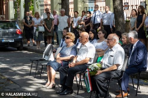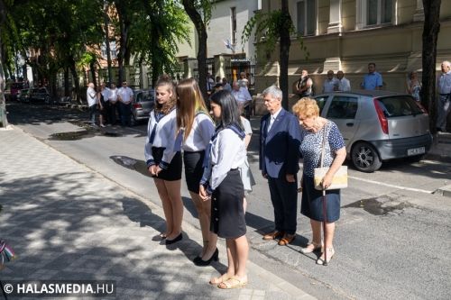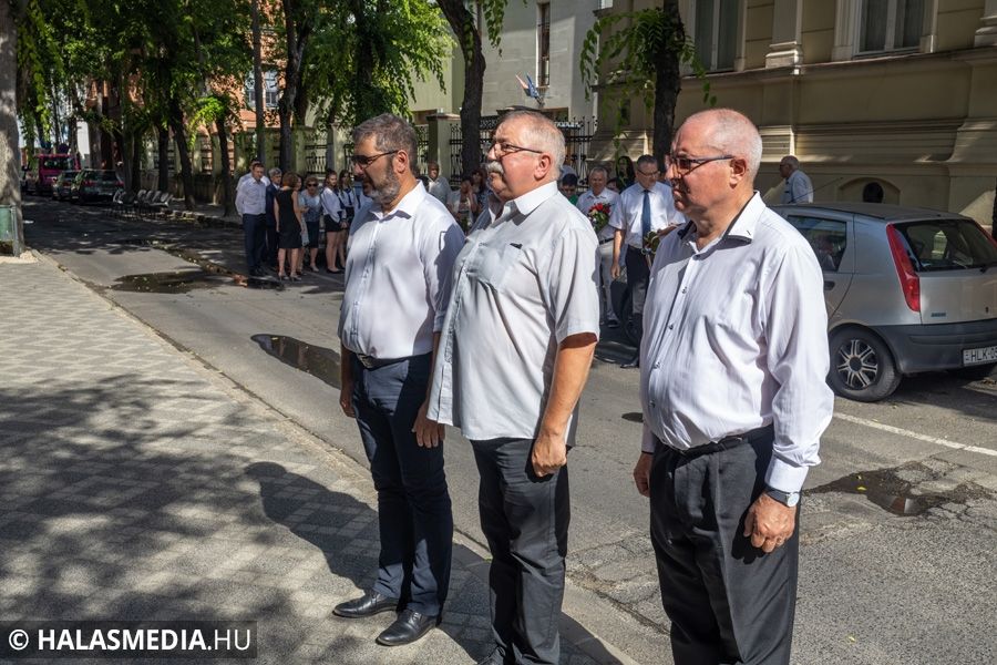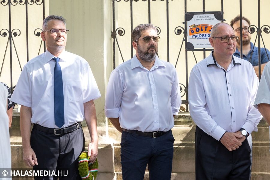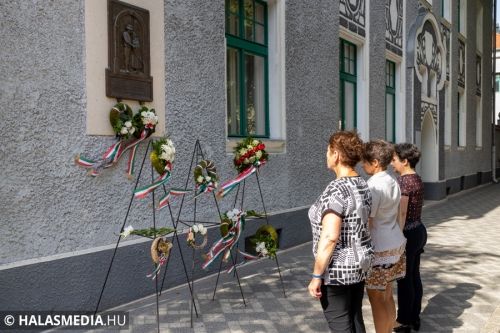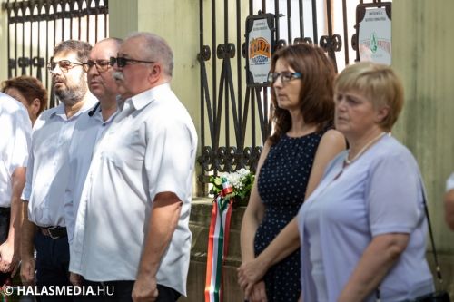 Ezt követően a Városháza utcai emléktáblánál koszorúkat, virágokat, mécseseket helyeztek el. A város nevében Fülöp Róbert polgármester és Kuris István László alpolgármester koszorúzott.
