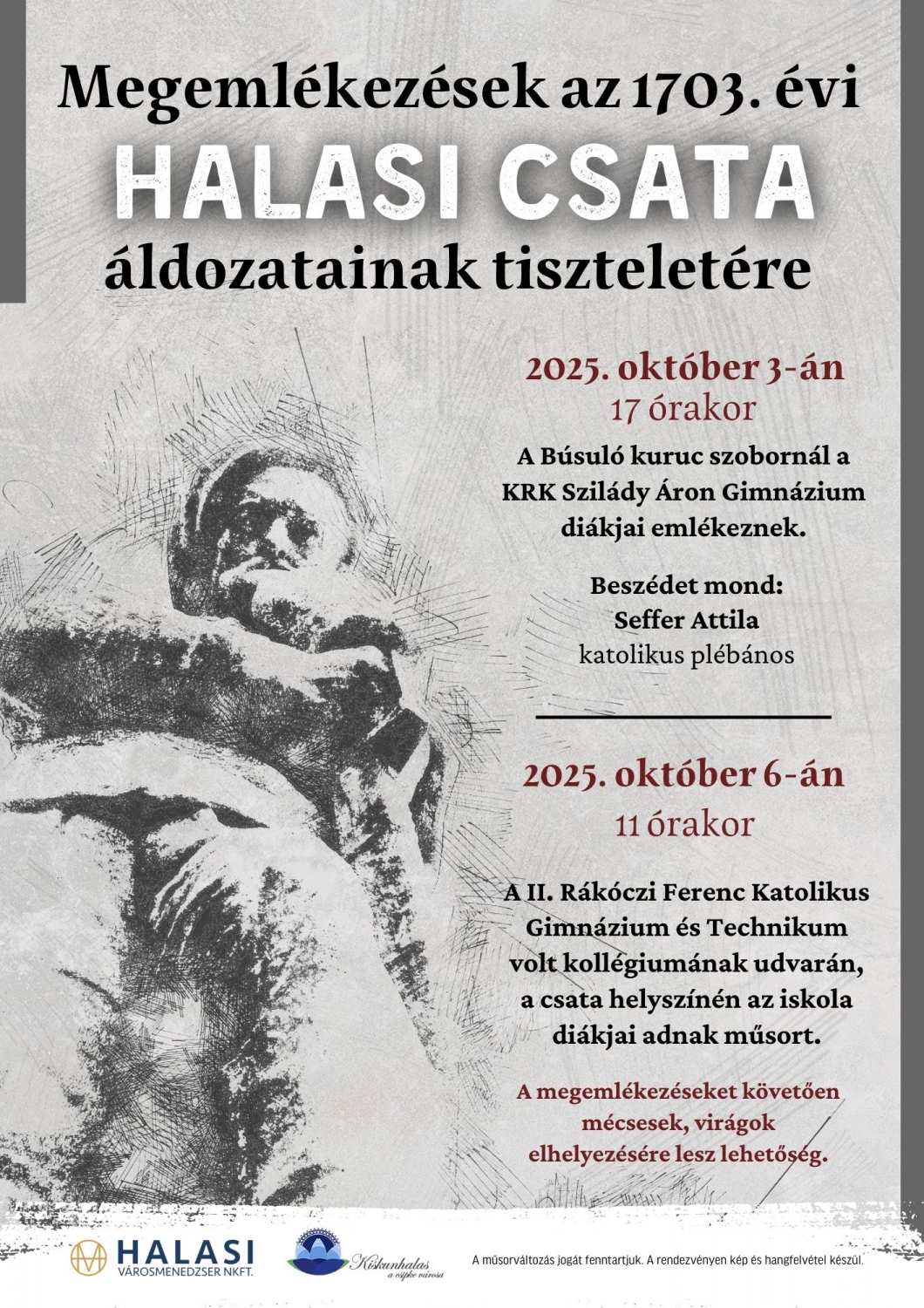 Emlékezzünk együtt a kuruc-labanc ütközetre! 1703 október 5-én a Rákóczi-szabadságharc egyik legvéresebb csatája zajlott Halas határában. A városi ünnepség október 3-án, pénteken 17 órakor kezdődik a Búsuló kuruc-szobornál, a Bercsényi és Kossuth utcák kereszteződésénél a Halasi Városmenedzser Nonprofit Kft. szervezésében.