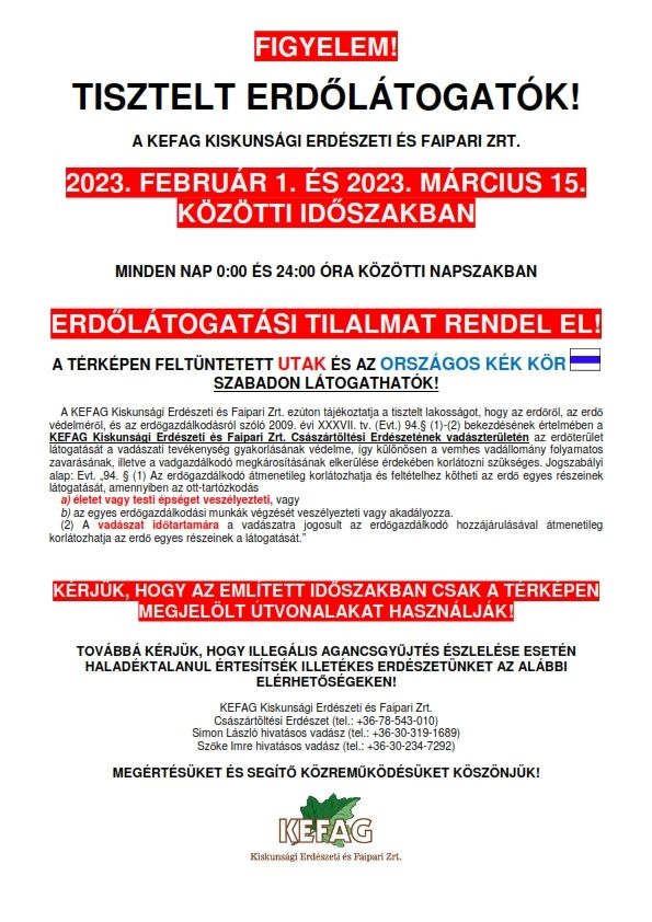 Időszakosan minden évben előfordul, hogy bizonyos területeken erdőlátogatási tilalmat rendelnek a térségünkben. A Kiskunsági Erdészeti és Faipari Zrt. illetékességébe tartozó egyes területein 2023. február 01-től 2023. március 15-ig erdőlátogatási tilalmat vezet be. Ugyanakkor a kéktúra útvonala látogatható! Erről tájékoztatást és pontos térképet is közreadott az erdészeti társaság (címképünk illusztráció).